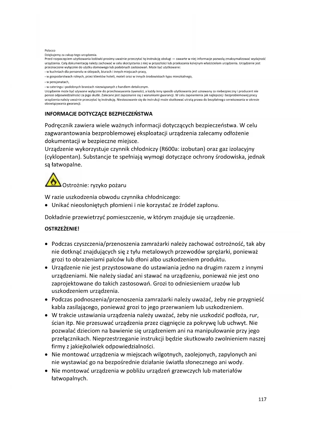 - ZLOMOWANIE 17 Polacco Dziękujemy za zakup tego urządzenia. Przed rozpoczęciem użytkowania lodówki prosimy uważnie przeczytać tę instrukcję obsługi — zawarte w niej informacje pozwolą zmaksymalizować wydajność urządzenia. Całą dokumentację należy zachować w celu skorzystania z niej w przyszłości lub przekazania kolejnym właścicielom urządzenia. Urządzenie jest przeznaczone wyłącznie do użytku domowego lub podobnych zastosowań. Może być użytkowane: - w kuchniach dla personelu w sklepach, biurach i innych miejscach pracy, - w gospodarstwach rolnych, przez klientów hoteli, moteli oraz w innych środowiskach typu mieszkalnego, - w pensjonatach, - w cateringu i podobnych branżach niezwiązanych z handlem detalicznym. Urządzenie może być używane wyłącznie do przechowywania żywności, a każdy inny sposób użytkowania jest uznawany za niebezpieczny i producent nie ponosi odpowiedzialności za jego skutki. Zalecane jest zapoznanie się z warunkami gwarancji. W celu zapewnienia jak najlepszej i bezproblemowej pracy urządzenia należy uważnie przeczytać tę instrukcję. Niestosowanie się do instrukcji może skutkować utratą prawa do bezpłatnego serwisowania w okresie obowiązywania gwarancji. p. 1271
