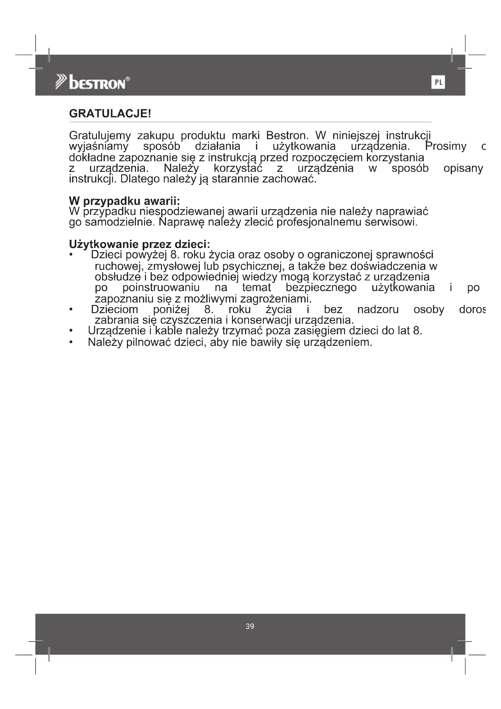 GRATULACJE! Gratulujemy zakupu produktu marki Bestron. W niniejszej instrukcji wyjaśniamy sposób działania i użytkowania urządzenia. Prosimy o dokładnezapoznaniesięzinstrukcjąprzedrozpoczęciemkorzystania z urządzenia. Należy korzystać z urządzenia w sposób opisany w instrukcji.Dlategonależyjąstaranniezachować. W przypadku awarii: Wprzypadkuniespodziewanejawariiurządzenianienależynaprawiać gosamodzielnie.Naprawęnależyzlecićprofesjonalnemuserwisowi. Użytkowanie przez dzieci: