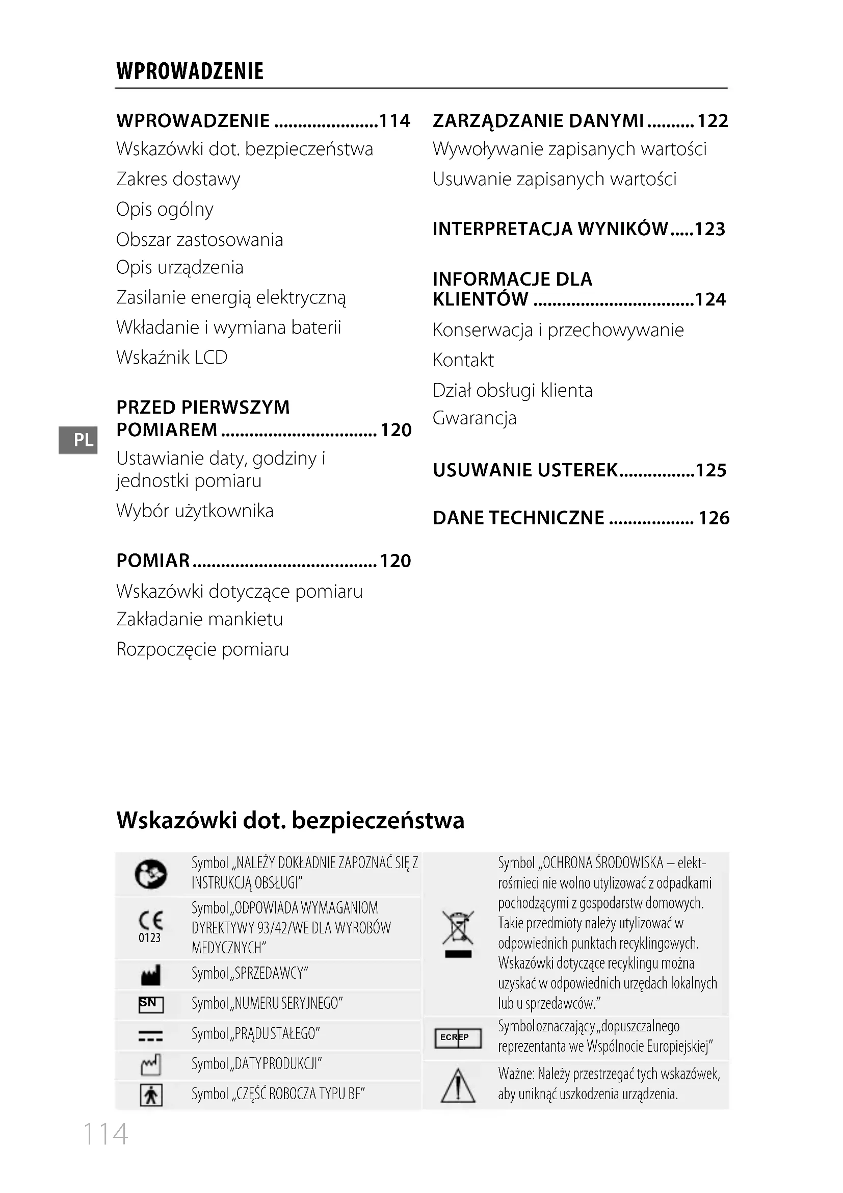 WPROWADZENIE WPROWADZENIE ......................114 Wskazówki dot. bezpieczeństwa Zakres dostawy Opis ogólny Obszar zastosowania Opis urządzenia Zasilanie energią elektryczną Wkładanie i wymiana baterii Wskaźnik LCD PRZED PIERWSZYM POMIAREM ................................. 120 Ustawianie daty, godziny i jednostki pomiaru Wybór użytkownika POMIAR ....................................... 120 Wskazówki dotyczące pomiaru Zakładanie mankietu Rozpoczęcie pomiaru