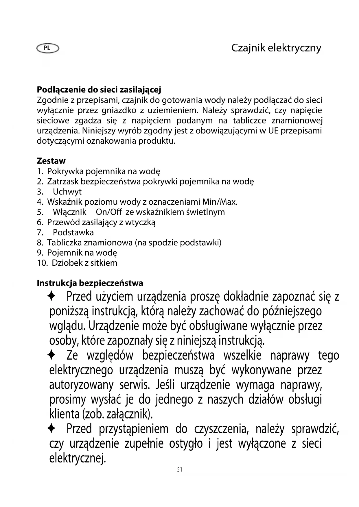 Instrukcja bezpieczeństwa ✦ Przed użyciem urządzenia proszę dokładnie zapoznać się z poniższą instrukcją, którą należy zachować do późniejszego wglądu. Urządzenie może być obsługiwane wyłącznie przez osoby, które zapoznały się z niniejszą instrukcją. ✦ Ze względów bezpieczeństwa wszelkie naprawy tego elektrycznego urządzenia muszą być wykonywane przez autoryzowany serwis. Jeśli urządzenie wymaga naprawy, prosimy wysłać je do jednego z naszych działów obsługi klienta (zob. załącznik). ✦ Przed przystąpieniem do czyszczenia, należy sprawdzić, czy urządzenie zupełnie ostygło i jest wyłączone z sieci elektrycznej. PL52 ✦ Nie zanurzać sprzętu w wodzie, ani nie myć go wodą, ponieważ grozi to porażeniem prądem. ✦ Osoby o ograniczonych zdolnościach zycznych, czuciowych lub psychicznych albo nieposiadające stosownego doświadczenia lub wiedzy, a także dzieci (w wieku co najmniej 8 lat), mogą korzystać z urządzenia, pod warunkiem że znajdują się pod nadzorem lub zostały poinstruowane, jak używać urządzenia i są w pełni świadome wszelkich zagrożeń i wymaganych środków ostrożności. ✦ Nie dopuszczać do używania urządzenia jako zabawki przez dzieci. ✦ Nie wolno pozwalać dzieciom na wykonywanie jakichkolwiek prac związanych bezpośrednio z konserwacją lub czyszczeniem urządzenia bez nadzoru osoby dorosłej. ✦ Nie dopuszczać do urządzenia i jego przewodu zasilającego dzieci w wieku poniżej 8 lat. ✦ Urządzenie przeznaczone jest do zastosowań domowych lub podobnych, jak np. w - biurach lub innych miejscach pracy; - agroturystyce; - hotelach, motelach itp. oraz innych podobnych miejscach zakwaterowania (przez klientów); - pensjonatach. ✦ Nie należy zostawiać włączonego czajnika bez nadzoru. Używać wyłącznie czystej wody i uważać, aby przy napełnianiu pojemnika poziom wody zawsze znajdował się pomiędzy oznaczeniami: minimum/maksimum. Przepełnienie pojemnika grozi wylaniem się wrzątku z53 urządzenia. ✦ Należy także uważać, aby nie oparzyć się gorącą parą wydobywającą się podczas gotowania. Nie dotykać żadnych części urządzenia oprócz uchwytu. ✦ Uwaga! Podczas gotowania a także wylewania gorącej wody, pokrywka pojemnika na wodę musi być zamknięta. ✦ Korzystając z czajnika należy używać wyłącznie dostarczonej wraz z nim podstawki. ✦ Nie wolno zdejmować pojemnika na wodę z podstawki (lub wymieniać go) kiedy urządzenie jest włączone. ✦ Uwaga: Nie pozwalać, aby dzieci miały dostęp do elementów opakowania, ponieważ może to doprowadzić do niebezpiecznego wypadku, np. uduszenia. ✦ Przed użyciem urządzenia należy dokładnie sprawdzić, czy jego korpus i wszystkie elementy czynnościowe są sprawne i nie noszą śladów uszkodzenia. Jeżeli urządzenie np. spadło na twardą powierzchnię albo przewód zasilający został narażony na zbyt silne szarpnięcie, nie nadaje się ono do dalszego użytku: nawet najmniejsza, niewidoczna usterka powstała z tego powodu, może mieć ujemny wpływ na działanie urządzenia i bezpieczeństwo użytkownika. ✦ Urządzenie musi zawsze być ustawione na równej i stabilnej powierzchni, odpornej na wysokie temperatury. ✦ Nie włączać urządzenia, kiedy znajduje się ono pod wiszącą szafką, półką lub innym podobnym przedmiotem; istnieje ryzyko gromadzenia się nadmiernej ilości pary. ✦ Korpus urządzenia rozgrzewa się do wysokiej temperatury w trakcie pracy i pozostaje gorący przez jakiś czas po jej zakończeniu. ✦ Należy uważać, aby przewód zasilający i korpus czajnika nie wchodziły w kontakt z płomieniami lub gorącymi powierzchniami, np. płytą kuchenki lub grzejną. ✦ Przewód zasilający nie powinien swobodnie zwisać i należy go zabezpieczyć przed stykaniem się z rozgrzanymi częściami urządzenia. ✦ Wtyczkę należy wyjąć z gniazdka elektrycznego: - po zakończeniu pracy - w przypadku awarii urządzenia - przed przystąpieniem do czyszczenia urządzenia.54 ✦ Za szkody wynikłe z nieprawidłowego używania sprzętu lub użytkowania niezgodnego z instrukcją obsługi odpowiedzialność ponosi wyłącznie użytkownik. Termiczny wyłącznik bezpieczeństwa Ustawiony fabrycznie termiczny czujnik odcina dopływ prądu i chroni urządzenie przed przegrzaniem w przypadku, gdyby włączono je przez pomyłkę bez wody lub gdy element grzejny znacznie pokryje się kamieniem. Czajnik, który wyłączy się automatycznie sam należy pozostawić do całkowitego ostygnięcia, a jeśli przyczyną jest osad kamienia, należy go wyczyścić. Przed użyciem czajnika po raz pierwszy Ze względów higienicznych, pierwszą zagotowaną partię wody należy wylać. Gotowanie wody ✦ Nie wolno zdejmować pojemnika na wodę z podstawki (lub wymieniać go) kiedy urządzenie jest włączone. ✦ Zdjąć czajnik z podstawki. ✦ Zwolnić i otworzyć pokrywkę i napełnić pojemnik wodą do żądanego poziomu, zwracając uwagę, aby nie przekraczać oznaczeń: maximum/ minimum. ✦ Przed zamknięciem pokrywki i umieszczeniem pojemnika na podstawce, należy upewnić się, czy urządzenie nie jest włączone. ✦ Włożyć wtyczkę do gniazdka elektrycznego i nacisnąć włącznik On/O . Zapali się wówczas lampka kontrolna. ✦ Rozpocznie się proces gotowania. Wbudowane parowe zabezpieczenie wyłączy urządzenie automatycznie po osiągnięciu punktu wrzenia. Lampka kontrolna zgaśnie. ✦ Aby przerwać proces gotowania, ustawić włącznik w pozycji O . ✦ Aby wylać zagotowaną wodę najpierw należy zdjąć czajnik z podstawki. ✦ Podczas wylewania gorącej wody należy uważać aby pokrywka dobrze przykrywała pojemnik i chroniła wydobywającą się gorącą parą. ✦ Po zakończeniu pracy wyjąć wtyczkę z gniazdka. ✦ Nie należy zostawiać wody w czajniku. Usuwanie osadów kamienia ✦ Osadzanie się kamienia zależeć będzie od jakości/twardości wody na danym tereni