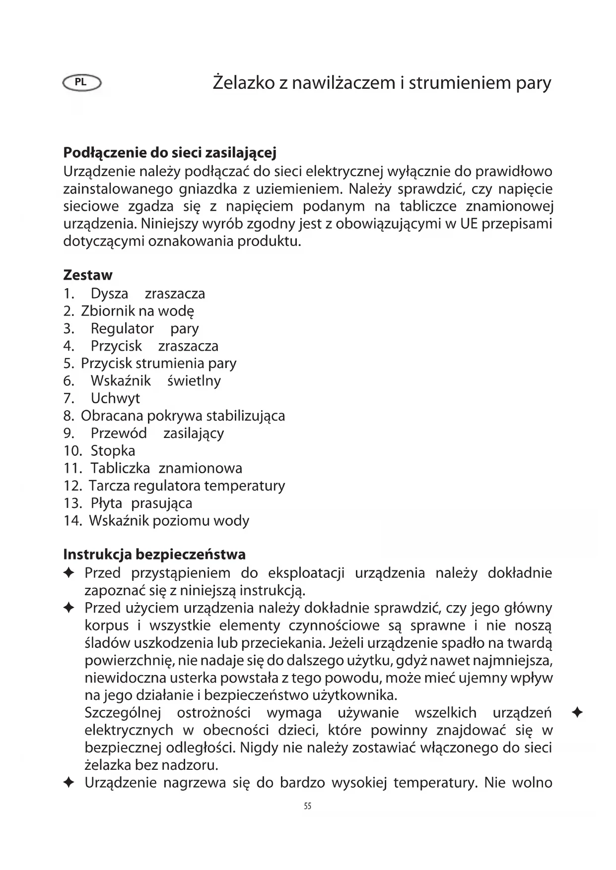 Instrukcja bezpieczeństwa Przed przystąpieniem do eksploatacji urządzenia należy dokładnie ✦ zapoznać się z niniejszą instrukcją. Przed użyciem urządzenia należy dokładnie sprawdzić, czy jego główny ✦ korpus i wszystkie elementy czynnościowe są sprawne i nie noszą śladów uszkodzenia lub przeciekania. Jeżeli urządzenie spadło na twardą powierzchnię, nie nadaje się do dalszego użytku, gdyż nawet najmniejsza, niewidoczna usterka powstała z tego powodu, może mieć ujemny wpływ na jego działanie i bezpieczeństwo użytkownika. Szczególnej ostrożności wymaga używanie wszelkich urządzeń ✦ elektrycznych w obecności dzieci, które powinny znajdować się w bezpiecznej odległości. Nigdy nie należy zostawiać włączonego do sieci żelazka bez nadzoru. Urządzenie nagrzewa się do bardzo wysokiej temperatury. Nie wolno ✦