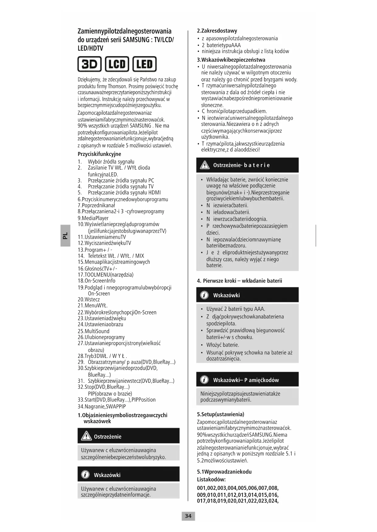 Zamienny pilot zdalnego sterowania do urządzeń serii SAMSUNG :TV/LCD/ LED/HDTV Dziękujemy, żezdecydowali się Państwo na zakup produktu firmy Thomson. Prosimy poświęcić trochę czasu na uważne przeczytanie poniższych instrukcji iinformacji. Instrukcję należyprzechowywać w bezpiecznym miejscu do późniejszego użytku. Za pomocą pilota zdalnego sterowania z ustawieniami fabrycznymi można sterować ok. 90% wszystkich urządzeń SAMSUNG .Nie ma potrzeby kongurowania pilota. Jeżeli pilot zdalnego sterowania nie funkcjonuje, wybrać jedną zopisanych wrozdziale 5możliwości ustawień. Przyciski funkcyjne