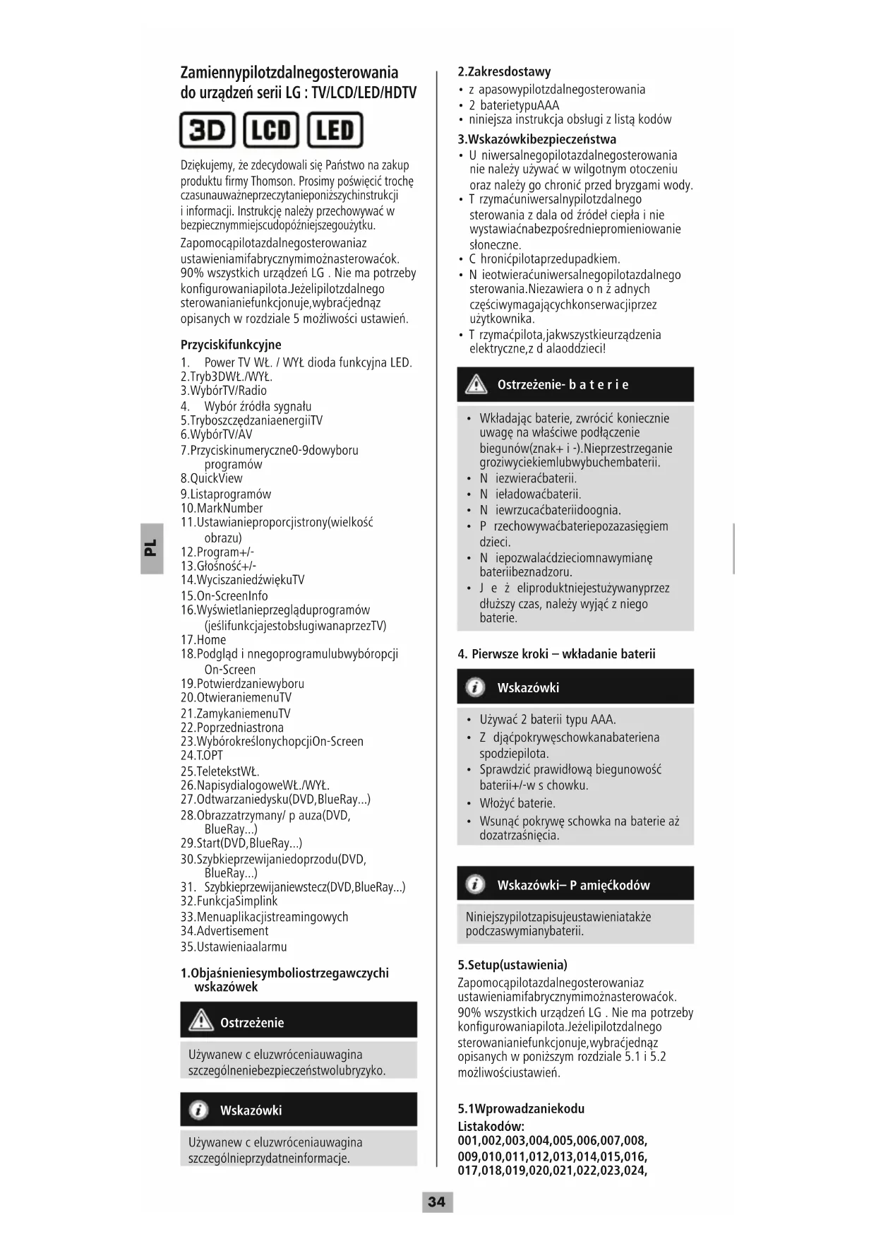 Zamienny pilot zdalnego sterowania do urządzeń serii LG :TV/LCD/LED/HDTV Dziękujemy, żezdecydowali się Państwo na zakup produktu firmy Thomson. Prosimy poświęcić trochę czasu na uważne przeczytanie poniższych instrukcji iinformacji. Instrukcję należyprzechowywać w bezpiecznym miejscu do późniejszego użytku. Za pomocą pilota zdalnego sterowania z ustawieniami fabrycznymi można sterować ok. 90% wszystkich urządzeń LG .Nie ma potrzeby kongurowania pilota. Jeżeli pilot zdalnego sterowania nie funkcjonuje, wybrać jedną z opisanych wrozdziale 5możliwości ustawień. Przyciski funkcyjne