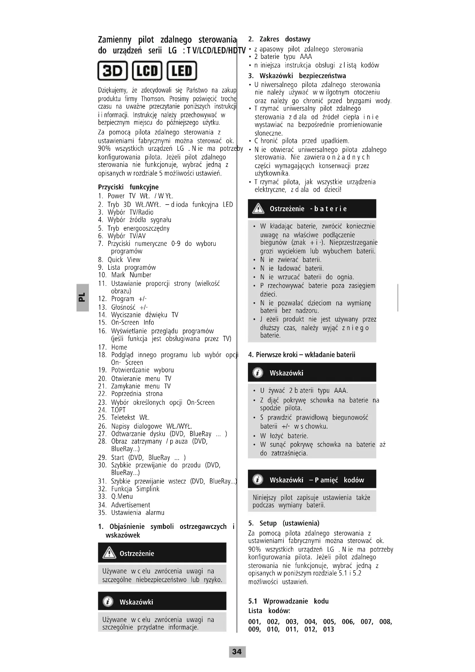 Zamienny pilot zdalnego sterowania do urządzeń serii LG :TV/LCD/LED/HDTV Dziękujemy, że zdecydowali się Państwo na zakup produktu firmy Thomson. Prosimy poświęcić trochę czasu na uważne przeczytanie poniższych instrukcji iinformacji. Instrukcję należy przechowywać w bezpiecznym miejscu do późniejszego użytku. Za pomocą pilota zdalnego sterowania z ustawieniami fabrycznymi można sterować ok. 90% wszystkich urządzeń LG .Nie ma potrzeby kongurowania pilota. Jeżeli pilot zdalnego sterowania nie funkcjonuje, wybrać jedną z opisanych wrozdziale 5możliwości ustawień. Przyciski funkcyjne