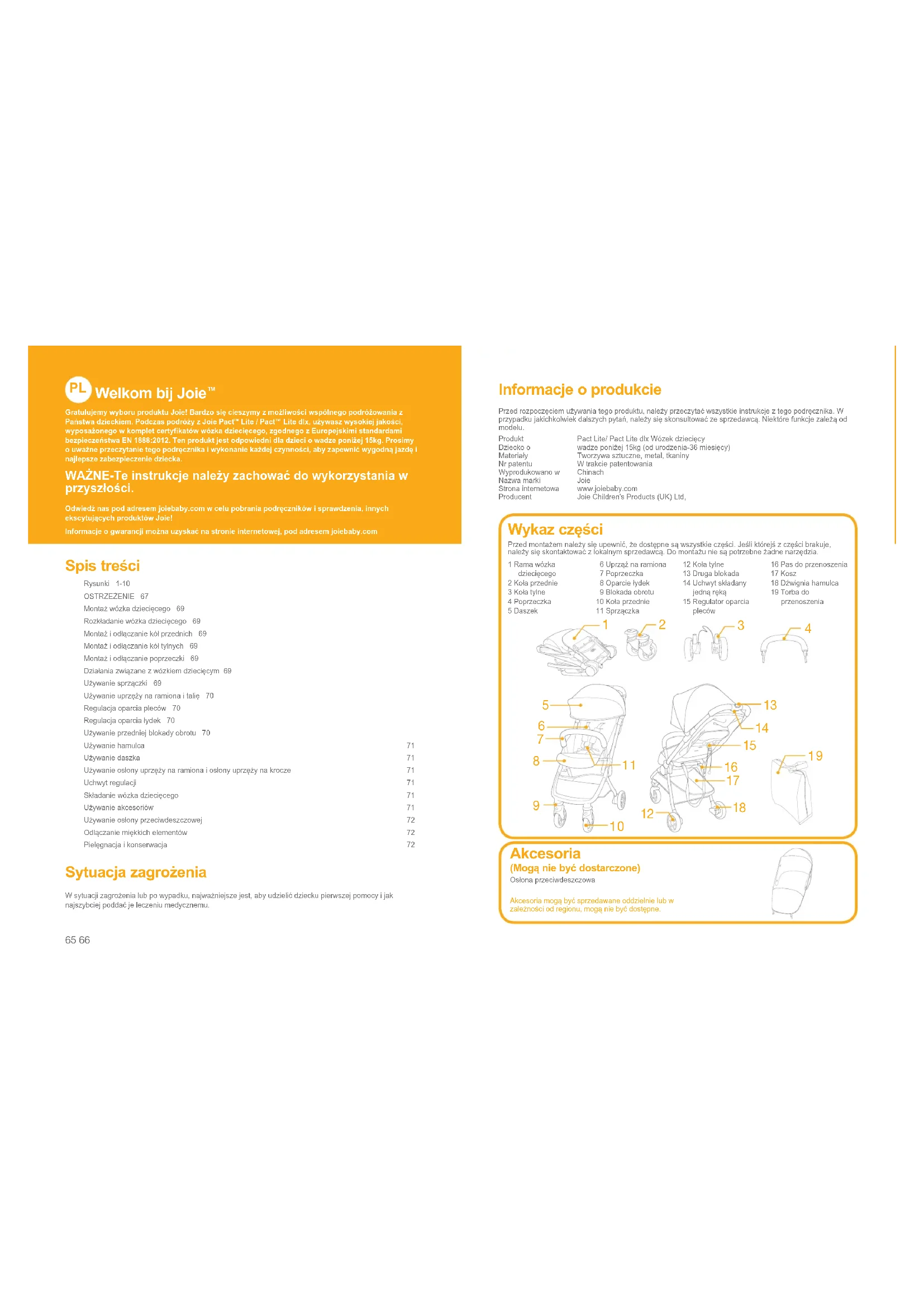 Gratulujemy wyboru produktu Joie! Bardzo się cieszymy z możliwości wspólnego podróżowania z Państwa dzieckiem. Podczas podróży z Joie Pact Lite / Pact Lite dlx, używasz wysokiej jakości, wyposażonego w komplet certyfikatów wózka dziecięcego, zgodnego z Europejskimi standardami bezpieczeństwa EN 1888:2012. Ten produkt jest odpowiedni dla dzieci o wadze poniżej 15kg. Prosimy o uważne przeczytanie tego podręcznika i wykonanie każdej czynności, aby zapewnić wygodną jazdę i najlepsze zabezpieczenie dziecka. WAŻNE-Te instrukcje należy zachować do wykorzystania w przyszłości. Odwiedź nas pod adresem joiebaby.com w celu pobrania podręczników i sprawdzenia, innych ekscytujących produktów Joie!Informacje o gwarancji można uzyskać na stronie internetowej, pod adresem joiebaby.com Spis treści Rysunki 1-10OSTRZEŻENIE 67Montaż wózka dziecięcego 69Rozkładanie wózka dziecięcego 69Montaż i odłączanie kół przednich 69Montaż i odłączanie kół tylnych 69Montaż i odłączanie poprzeczki 69Działania związane z wózkiem dziecięcym 69Używanie sprzączki 69Używanie uprzęży na ramiona i talię 70Regulacja oparcia pleców 70Regulacja oparcia łydek 70Używanie przedniej blokady obrotu 70Używanie hamulca 71Używanie daszka 71Używanie osłony uprzęży na ramiona i osłony uprzęży na krocze 71Uchwyt regulacji 71Składanie wózka dziecięcego 71Używanie akcesoriów 71Używanie osłony przeciwdeszczowej 72Odlączanie miękkich elementów 72Pielęgnacja i konserwacja 72 Sytuacja zagrożenia W sytuacji zagrożenia lub po wypadku, najważniejsze jest, aby udzielić dziecku pierwszej pomocy i jak najszybciej poddać je leczeniu medycznemu. Informacje o produkcie Przed rozpoczęciem używania tego produktu, należy przeczytać wszystkie instrukcje z tego podręcznika. W przypadku jakichkolwiek dalszych pytań, należy się skonsultować ze sprzedawcą. Niektóre funkcje zależą od modelu.Produkt Pact Lite/ Pact Lite dlx Wózek dziecięcyDziecko o wadze poniżej 15kg (od urodzenia-36 miesięcy)Materiały Tworzywa sztuczne, metal, tkaninyNr patentu W trakcie patentowaniaWyprodukowano w ChinachNazwa marki JoieStrona internetowa www.joiebaby.comProducent Joie Children's Products (UK) Ltd,1 Rama wózka dziecięcego2 Koła przednie3 Koła tylne4 Poprzeczka5 Daszek 6 Uprząż na ramiona 7 Poprzeczka 8 Oparcie łydek 9 Blokada obrotu10 Koła przednie11 Sprzączka12 Koła tylne13 Druga blokada14 Uchwyt składany jedną ręką15 Regulator oparcia pleców16 Pas do przenoszenia17 Kosz18 Dźwignia hamulca19 Torba do przenoszenia Wykaz części Przed montażem należy się upewnić, że dostępne są wszystkie części. Jeśli którejś z części brakuje, należy się skontaktować z lokalnym sprzedawcą. Do montażu nie są potrzebne żadne narzędzia. Akcesoria (Mogą nie być dostarczone) Osłona przeciwdeszczowaAkcesoria mogą być sprzedawane oddzielnie lub w zależności od regionu, mogą nie być dostępne.67 68 OSTRZEŻENIE ! OSTRZEŻENIE Należy zawsze używać systemem przytrzymującym. Pasy bezpieczeństwa i systemy przytrzymujące muszą być używane prawidłowo. ! OSTRZEŻENIE Przed użyciem należy się upewnić, że działają wszystk- ie urządzenia blokujące. ! OSTRZEŻENIE Nie należy pozwalać dziecku na zabawę z tym produk- tem. ! OSTRZEŻENIE Przed użyciem wózka dziecięcego lub systemu przytrzy- mującego dla niemowląt należy sprawdzić prawidłowość ich montażu. ! Wymagany montaż przez osobę dorosłą. ! Wózek dziecięcy można używać dla dziecka o wadze poniżej 15kg. Nie- odpowiednia waga dziecka może spowodować uszkodzenie wózka. ! Aby zapobiec niebezpiecznym sytuacjom, niestabilności, w koszu nie należy umieszczać więcej niż 4,5kg bagażu. ! Nigdy nie należy zostawiać dziecka bez nadzoru. Dziecko w wózku pow- inno być zawsze widoczne. ! W wózku dziecięcym może znajdować się jednocześnie tylko jedno dziecko. Nigdy nie należy zawieszać torebek, toreb na zakupy, paczek lub akcesoriów na uchwycie lub na daszku. ! Nie należy używać akcesoriów niezatwierdzonych przez producenta. Używać należy wyłącznie części zamiennych dostarczonych lub zale- canych przez producenta. ! Nigdy nie należy używać akcesoriów, części lub komponentów nie wyprodukowanych lub nie zatwierdzonych przez producenta. Należy dokładnie przeczytać podręcznik. ! Przed użyciem tego produktu, należy przeczytać wszystkie instrukcje z tego podręcznika. Ten podręcznik należy zachować do przyszłego uży- cia. Niestosowanie się do tych ostrzeżeń i instrukcji, może spowodować poważne obrażenia lub śmierć. ! Aby uniknąć poważnych obrażeń w wyniku upadku lub zsunięcia, należy używać pasa bezpieczeństwa. ! Podczas regulacji wózka dziecięcego należy się upewnić, że na ciele dziecka nie ma ruchomych części. ! Przed pozwoleniem dziecku na zbliżenie się do wózka należy się up- ewnić, że wózek dziecięcy jest całkowicie otwarty lub złożony. ! Jeśli nie będzie używana uprząż, dziecko może ześlizgnąć się do szcze- lin na nogi i udusić się. ! Nigdy nie należy używać wózka dziecięcego na schodach lub w win- dach. ! Należy unikać obiektów o wysokich temperaturach, płynów i elektroniki. ! Nigdy nie należy pozwalać dziecku stawać w wózku lub siadać w wózku głową zwrócona w kierunku wózka. ! Wózka dziecięcego nigdy nie należy ustawiać na drogach, stokach lub w niebezpiecznych miejscach. ! Aby uniknąć uduszenia, NIE wolno umieszczać na szyi dziecka ele- mentów ze sznurkiem, pozostawiać wiszących sznurków na tym pro- dukcie lub wiązać sznurków do zabawek. ! Wszelkie obciążenia przymocowane do uchwytu i/lub do oparcia tylnego i/lub z boków wózka dziecięcego, wpłyną na stabilność wózka dziecięcego.