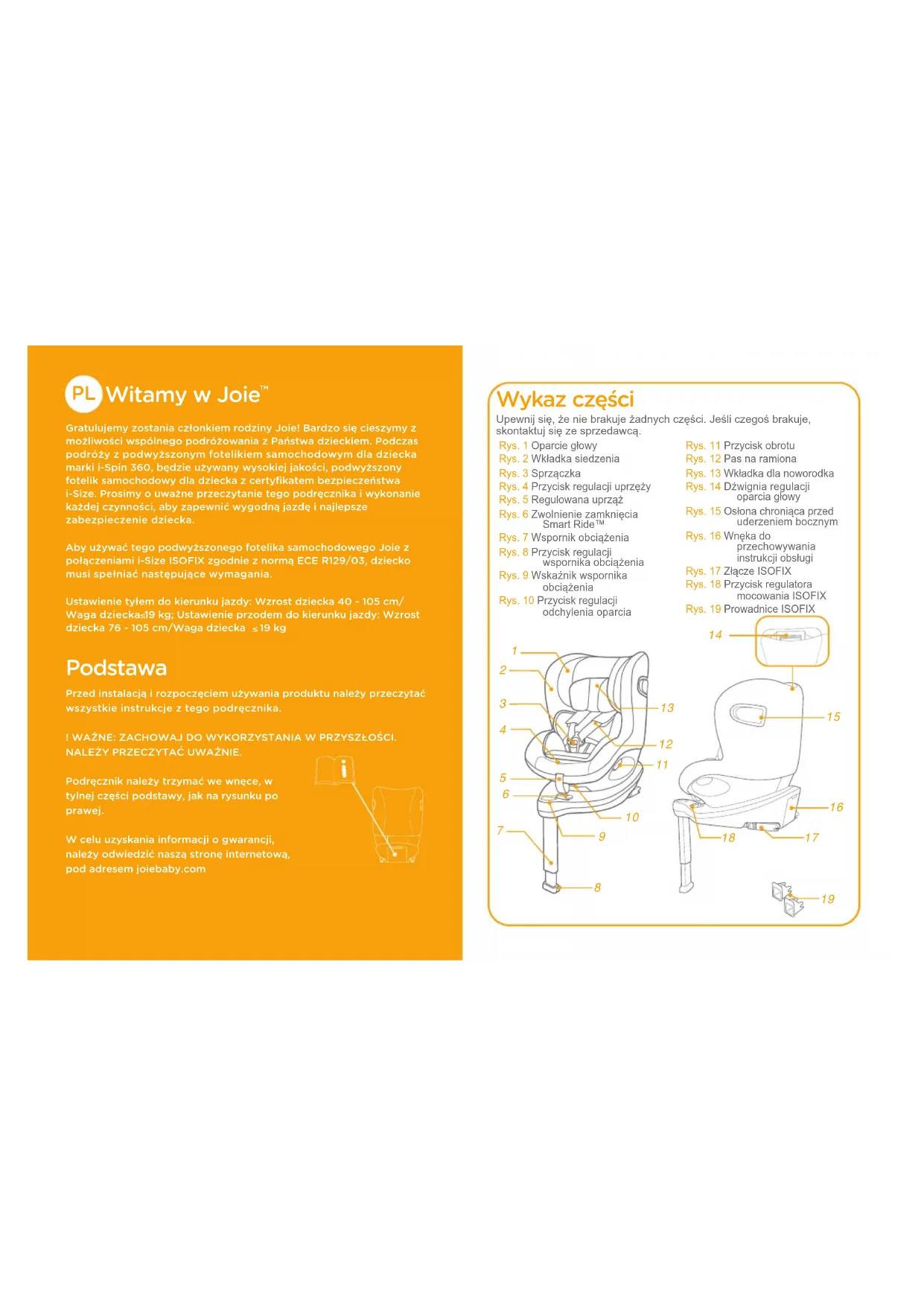 Gratulujemy zostania członkiem rodziny Joie! Bardzo się cieszymy z możliwości wspólnego podróżowania z Państwa dzieckiem. Podczas podróży z podwyższonym fotelikiem samochodowym dla dziecka marki i-Spin 360, będzie używany wysokiej jakości, podwyższony fotelik samochodowy dla dziecka z certyfikatem bezpieczeństwa i-Size. Prosimy o uważne przeczytanie tego podręcznika i wykonanie każdej czynności, aby zapewnić wygodną jazdę i najlepsze zabezpieczenie dziecka.Aby używać tego podwyższonego fotelika samochodowego Joie z połączeniami i-Size ISOFIX zgodnie z normą ECE R129/03, dziecko musi spełniać następujące wymagania.Ustawienie tyłem do kierunku jazdy: Wzrost dziecka 40 - 105 cm/Waga dziecka 19 kg; Ustawienie przodem do kierunku jazdy: Wzrost dziecka 76 - 105 cm/Waga dziecka ≤ 19 kg Podstawa Przed instalacją i rozpoczęciem używania produktu należy przeczytać wszystkie instrukcje z tego podręcznika.! WAŻNE: ZACHOWAJ DO WYKORZYSTANIA W PRZYSZŁOŚCI.NALEŻY PRZECZYTAĆ UWAŻNIE.Podręcznik należy trzymać we wnęce, w tylnej części podstawy, jak na rysunku po prawej.W celu uzyskania informacji o gwarancji, należy odwiedzić naszą stronę internetową, pod adresem joiebaby.com Wykaz części Rys. 1 Oparcie głowyRys. 2 Wkładka siedzeniaRys. 3 SprzączkaRys. 4 Przycisk regulacji uprzęży Rys. 5 Regulowana uprzążRys. 6 Zwolnienie zamknięcia Smart Ride™Rys. 7 Wspornik obciążeniaRys. 8 Przycisk regulacji wspornika obciążeniaRys. 9 Wskaźnik wspornika obciążeniaRys. 10 Przycisk regulacji odchylenia oparciaRys. 11 Przycisk obrotuRys. 12 Pas na ramionaRys. 13 Wkładka dla noworodka Rys. 14 Dźwignia regulacji oparcia głowyRys. 15 Osłona chroniąca przed uderzeniem bocznymRys. 16 Wnęka do przechowywania instrukcji obsługiRys. 17 Złącze ISOFIXRys. 18 Przycisk regulatora mocowania ISOFIXRys. 19 Prowadnice ISOFIXUpewnij się, że nie brakuje żadnych części. Jeśli czegoś brakuje, skontaktuj się ze sprzedawcą.