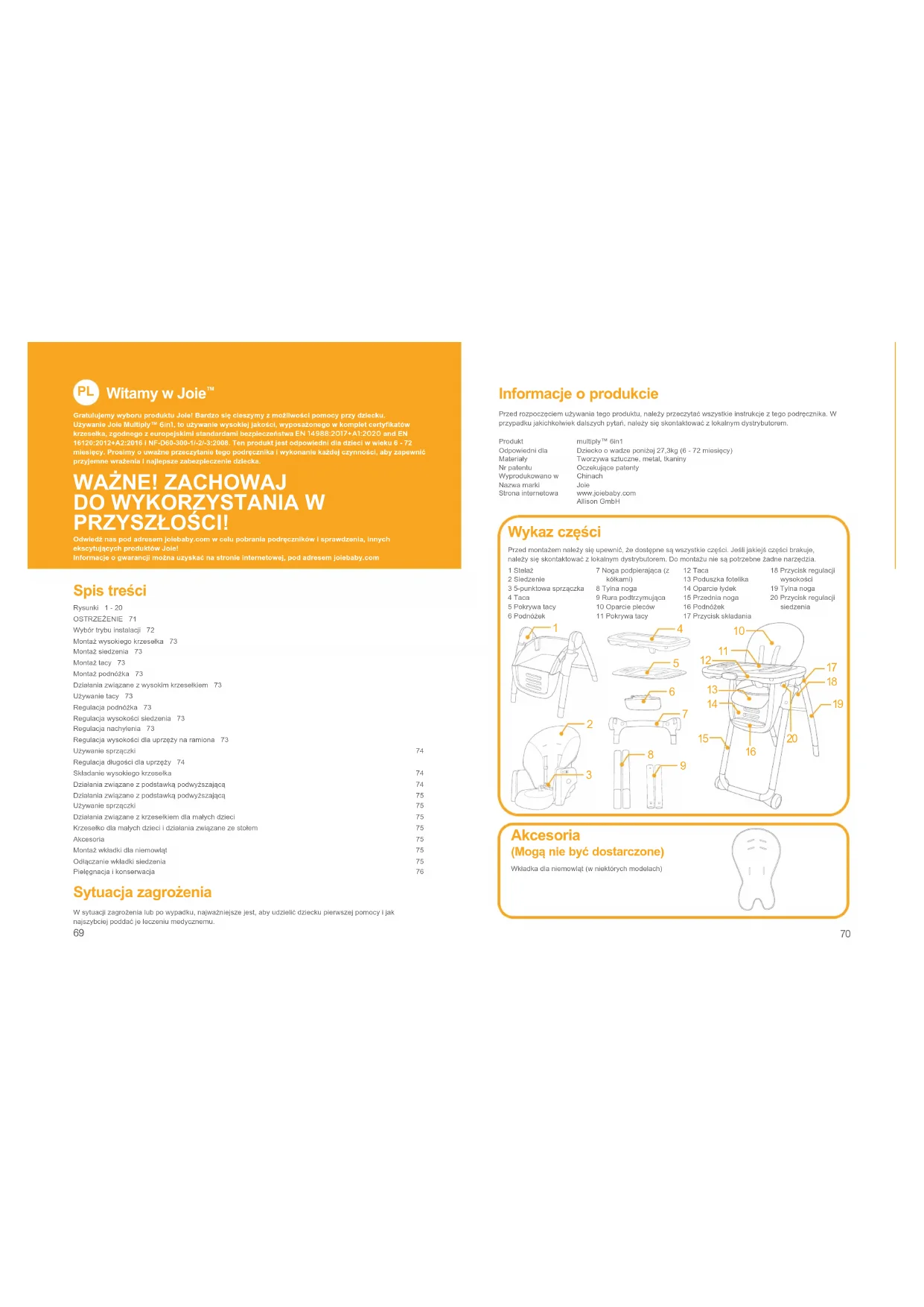PRZYSZŁOŚCI! Odwiedź nas pod adresem joiebaby.com w celu pobrania podręczników i sprawdzenia, innych ekscytujących produktów Joie!Informacje o gwarancji można uzyskać na stronie internetowej, pod adresem joiebaby.com Spis treści Rysunki 1 - 20OSTRZEŻENIE 71Wybór trybu instalacji 72Montaż wysokiego krzesełka 73Montaż siedzenia 73Montaż tacy 73Montaż podnóżka 73Działania związane z wysokim krzesełkiem 73Używanie tacy 73Regulacja podnóżka 73Regulacja wysokości siedzenia 73Regulacja nachylenia 73Regulacja wysokości dla uprzęży na ramiona 73Używanie sprzączki 74Regulacja długości dla uprzęży 74Składanie wysokiego krzesełka 74Działania związane z podstawką podwyższającą 74Działania związane z podstawką podwyższającą 75Używanie sprzączki 75Działania związane z krzesełkiem dla małych dzieci 75Krzesełko dla małych dzieci i działania związane ze stołem 75Akcesoria 75Montaż wkładki dla niemowląt 75Odłączanie wkładki siedzenia 75Pielęgnacja i konserwacja 76 Sytuacja zagrożenia W sytuacji zagrożenia lub po wypadku, najważniejsze jest, aby udzielić dziecku pierwszej pomocy i jak najszybciej poddać je leczeniu medycznemu. Informacje o produkcie Przed rozpoczęciem używania tego produktu, należy przeczytać wszystkie instrukcje z tego podręcznika. W przypadku jakichkolwiek dalszych pytań, należy się skontaktować z lokalnym dystrybutorem.Produkt multiply™ 6in1Odpowiedni dla Dziecko o wadze poniżej 27,3kg (6 - 72 miesięcy)Materiały Tworzywa sztuczne, metal, tkaninyNr patentu Oczekujące patentyWyprodukowano w ChinachNazwa marki JoieStrona internetowa www.joiebaby.com Allison GmbH Akcesoria (Mogą nie być dostarczone) Wkładka dla niemowląt (w niektórych modelach) Wykaz części Przed montażem należy się upewnić, że dostępne są wszystkie części. Jeśli jakiejś części brakuje, należy się skontaktować z lokalnym dystrybutorem. Do montażu nie są potrzebne żadne narzędzia.