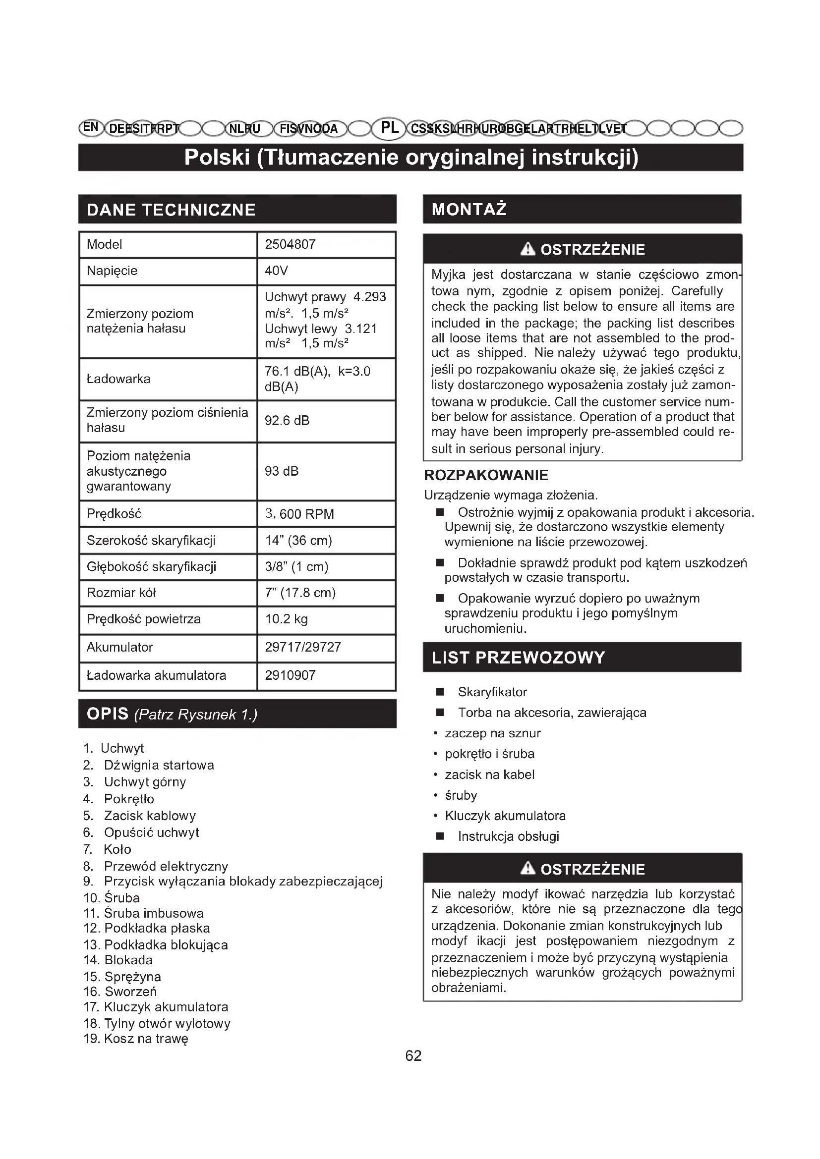 DE ES IT FR PTNL RUFI SV NO DA CS SK SL HR HU RO BG EL AR TR HE LT LV ET MONTAŻ OSTRZEŻENIE Myjka jest dostarczana w stanie częściowo zmon- towa nym, zgodnie z opisem poniżej. Carefully check the packing list below to ensure all items are included in the package; the packing list describes all loose items that are not assembled to the prod- uct as shipped. Nie należy używać tego produktu, jeśli po rozpakowaniu okaże się, że jakieś części z listy dostarczonego wyposażenia zostały już zamon- towana w produkcie. Call the customer service num- ber below for assistance. Operation of a product that may have been improperly pre-assembled could re- sult in serious personal injury. ROZPAKOWANIE Urządzenie wymaga złożenia. Ostrożnie wyjmij z opakowania produkt i akcesoria. Upewnij się, że dostarczono wszystkie elementy wymienione na liście przewozowej. Dokładnie sprawdź produkt pod kątem uszkodzeń powstałych w czasie transportu. Opakowanie wyrzuć dopiero po uważnym sprawdzeniu produktu i jego pomyślnym uruchomieniu. LIST PRZEWOZOWY Skaryfikator Torba na akcesoria, zawierająca