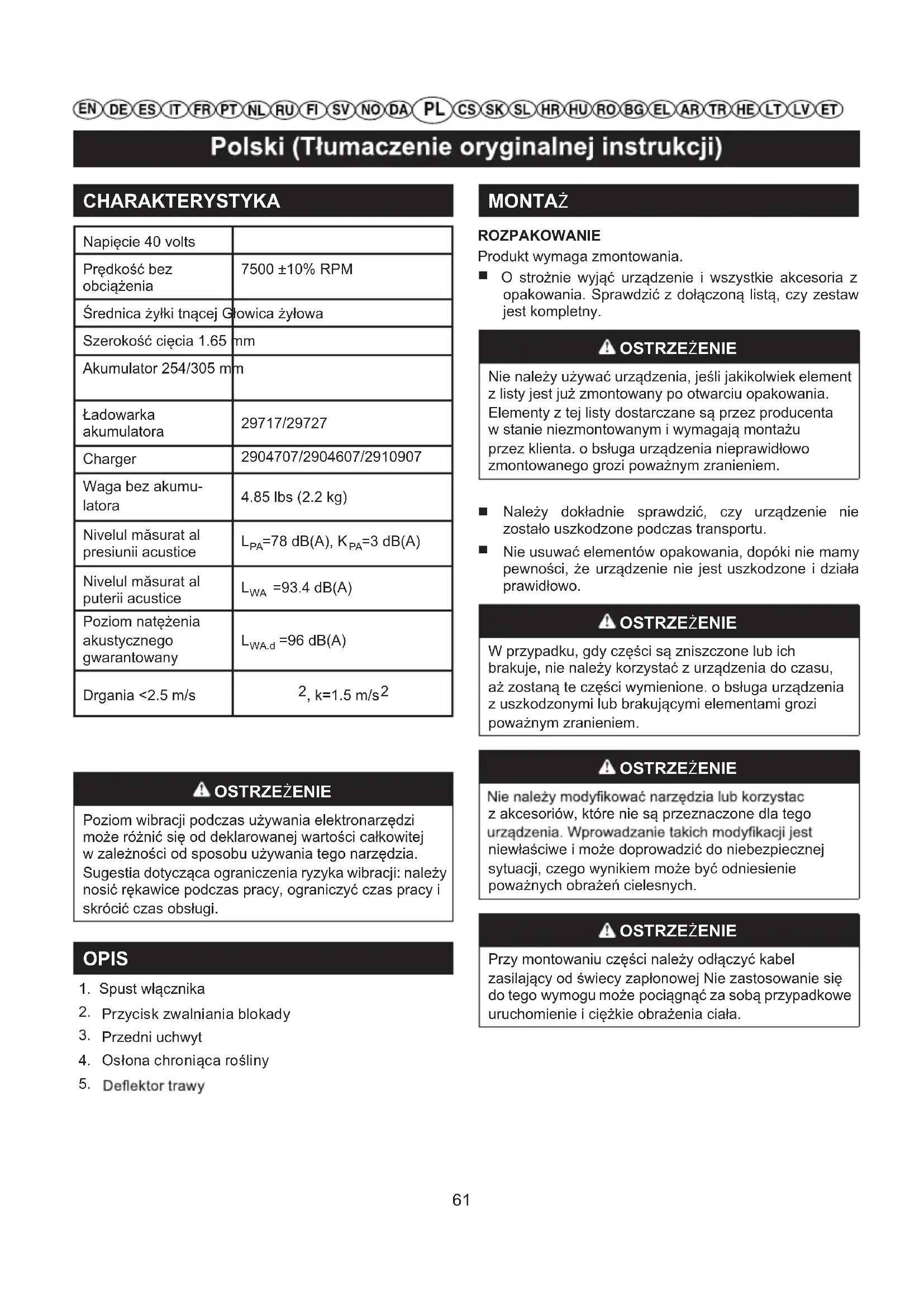 Żyłka nie wysuwa się z głowicy wyposażonej w mechanizm automatycznego podawania żyłki. Żyłka jest sklejona (zgrzana razem). Nasmarować żyłkę smarem silikonowym w aerozolu. Niewystarczająca długość żyłki na szpuli. Zamontuj więcej żyłki. Przeczytaj rozdział poświęcony wymianie żyłki. Końcówki żyłki są zużyte I zbyt krótkie. Pociągnąć za żyłkę, naciskając przycisk. Żyłka jest zaplątana na szpuli. Rozwinąć żyłkę ze szpuli i ponownie nawinąć. Przeczytaj rozdział poświęcony wymianie żyłki. Grass wraps around shaft housing and string head. Cięcie długiej trawy tuż przy ziemi. Trawę ścinać od góry, warstwami, co Motor fails to start when switch trigger is depressed. Akumulator nie jest prawidłowo założony. Przy prawidłowym założeniu akumulatora, zatrzaski po obydwu stronach powinny trać na swoje miejsce. Akumulator nie jest aładowany. Naładować akumulator zgodnie z instrukcją dołączoną do niego. dotyczących usuwania materiału pozostałego po koszeniu. Po ostatecznym zaniechaniu używania maszyny, nie porzucać jej w środowisku, lecz zwrócić się do punktu selektywnego gromadzenia odpadó. 65POPIS Elektrické napětí 40 volts Rychlost naprázdno 7500 ±10% RPM Sekací hlava Přísun nárazem Průměr selací šňůry 1.65 mm Průměr selací stopy 254/305 mm Akumulátorový modul Nabíječka akumulátorů Hmotnost bez bate- riového modulu
