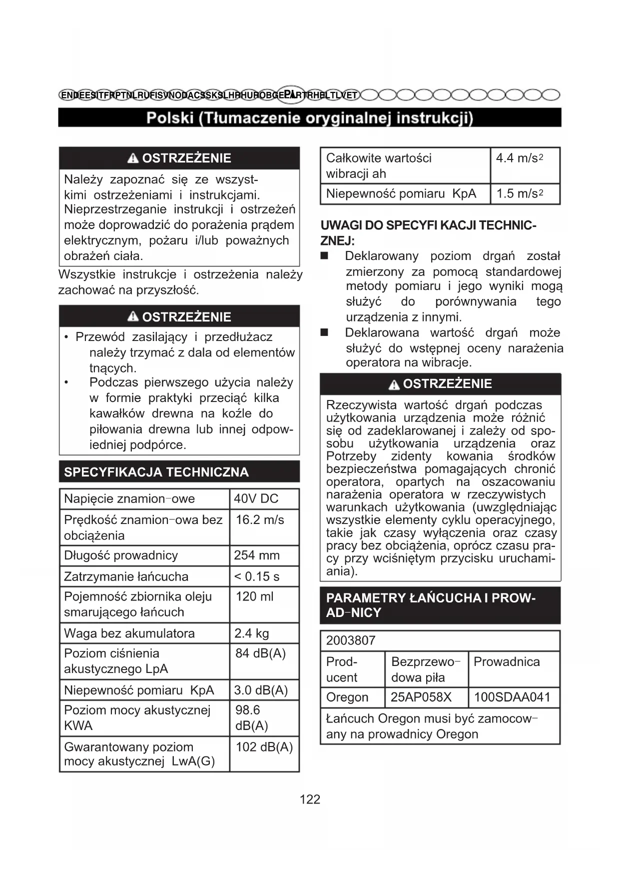 - Podczas pierwszego użycia należy w formie praktyki przeciąć kilka kawałków drewna na koźle do piłowania drewna lub innej odpow- iedniej podpórce. SPECYFIKACJA TECHNICZNA Napięcie znamion-owe 40V DC Prędkość znamion-owa bez obciążenia