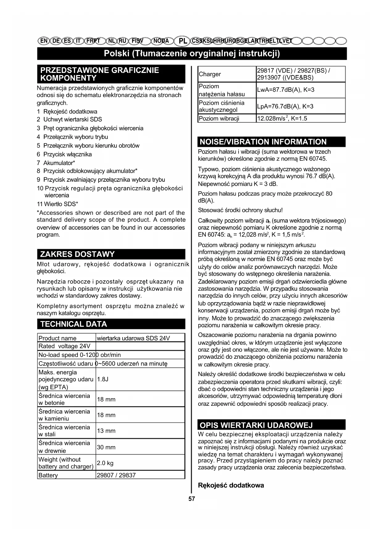 Battery 29807 / 29837 Charger 29817 (VDE) / 29827(BS) / 2913907 ((VDE&BS) Poziom natężenia hałasu LwA=87.7dB(A), K=3 Poziom ciśnienia akustycznegol LpA=76.7dB(A), K=3 Poziom wibracji 12.028m/s