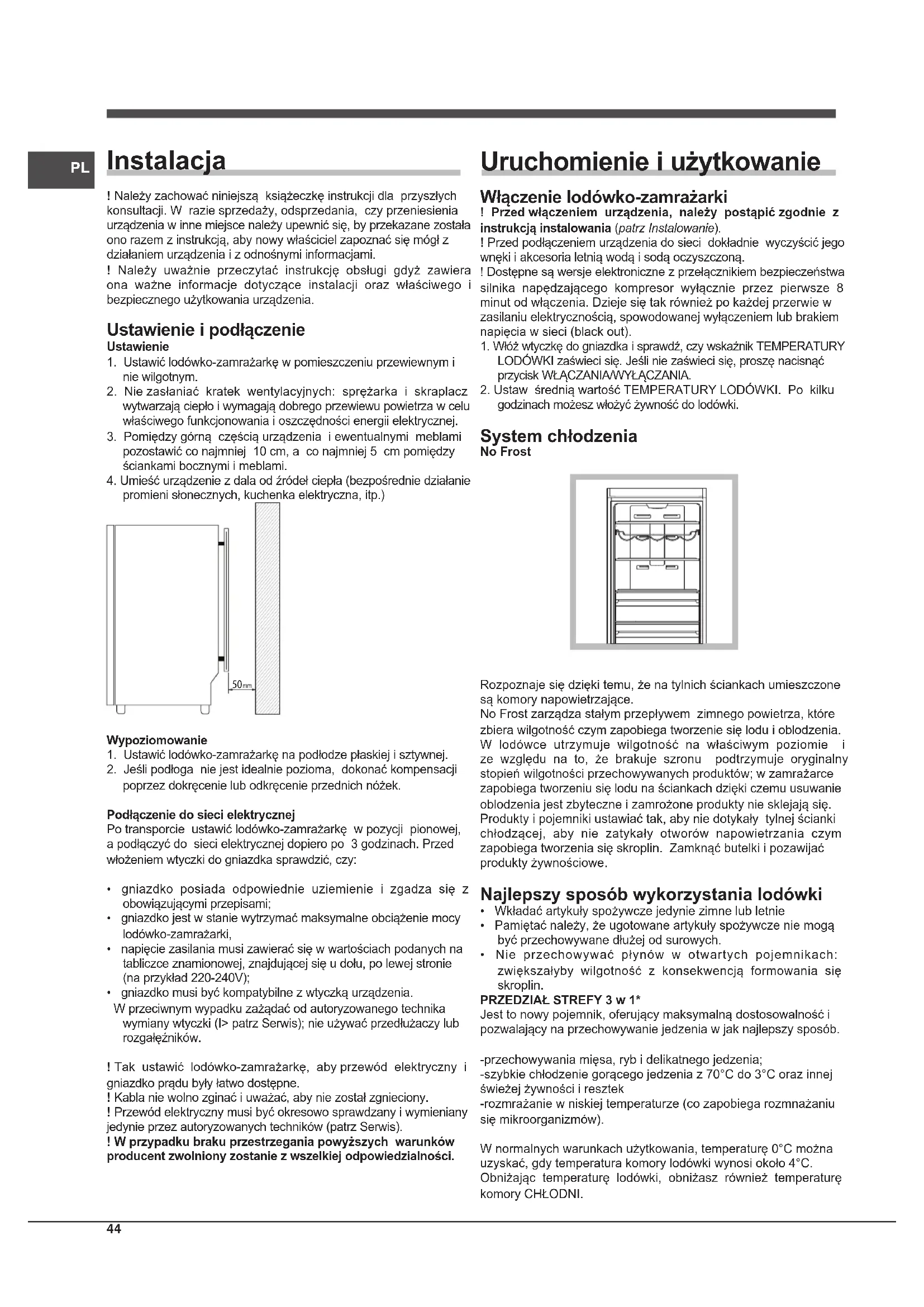 godzinach możesz włożyć żywność do lodówki. System chłodzenia No Frost Rozpoznaje się dzięki temu, że na tylnich ściankach umieszczone są komory napowietrzające. No Frost zarządza stałym przepływem zimnego powietrza, które zbiera wilgotność czym zapobiega tworzenie się lodu i oblodzenia. W lodówce utrzymuje wilgotność na właściwym poziomie i ze względu na to, że brakuje szronu podtrzymuje oryginalny stopień wilgotności przechowywanych produktów; w zamrażarce zapobiega tworzeniu się lodu na ściankach dzięki czemu usuwanie oblodzenia jest zbyteczne i zamrożone produkty nie sklejają się. Produkty i pojemniki ustawiać tak, aby nie dotykały tylnej ścianki chłodzącej, aby nie zatykały otworów napowietrzania czym zapobiega tworzenia się skroplin. Zamknąć butelki i pozawijać produkty żywnościowe. Najlepszy sposób wykorzystania lodówki