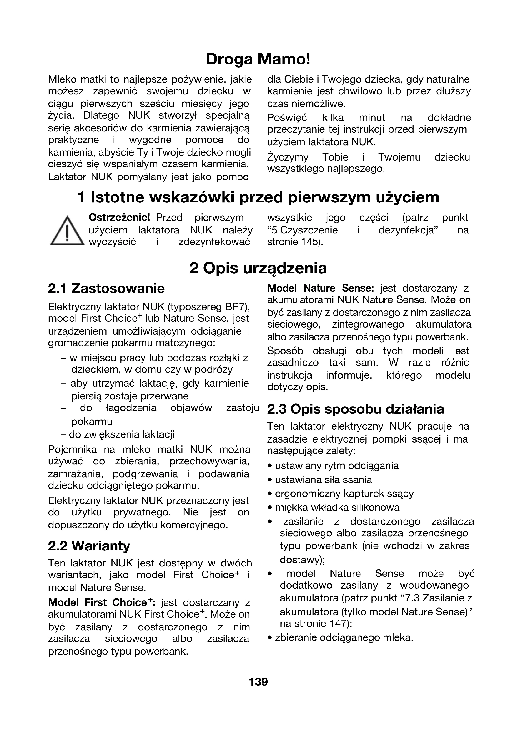 zeczytanie tej instrukcji przed pierwszym użyciem laktatora NUK. Życzymy Tobie i Twojemu dziecku wszystkiego najlepszego! 1 Istotne wskazówki przed pierwszym użyciem Ostrzeżenie! Przed pierwszym użyciem laktatora NUK należy wyczyścić i zdezynfekować wszystkie jego części (patrz punkt “5Czyszczenie i dezynfekcja” na stronie145). 2 Opis urządzenia