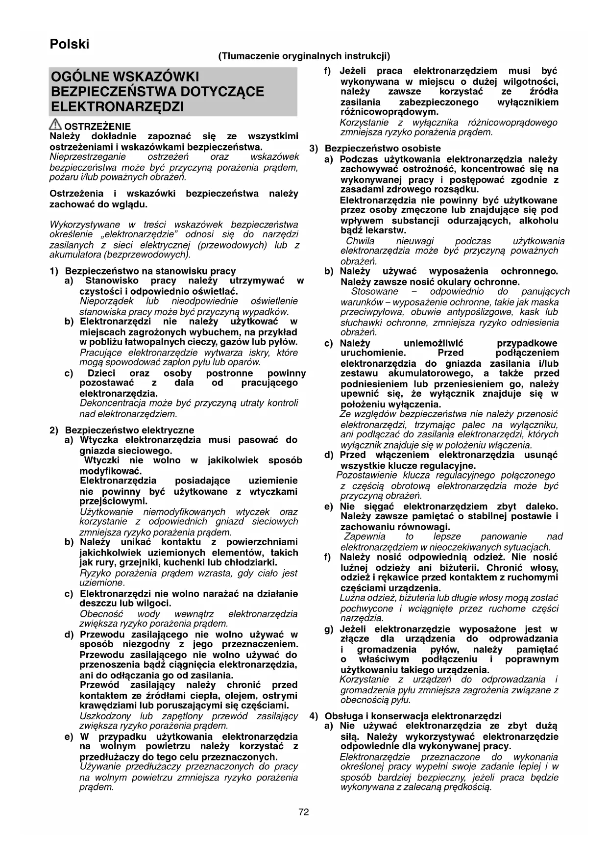 ELEKTRONARZĘDZI OSTRZEŻENIE Należy dokładnie zapoznać się ze wszystkimi ostrzeżeniami i wskazówkami bezpieczeństwa. Nieprzestrzeganie ostrzeżeń oraz wskazówek bezpieczeństwa może być przyczyną porażenia prądem, pożaru i/lub poważnych obrażeń. Ostrzeżenia i wskazówki bezpieczeństwa należy zachować do wglądu. Wykorzystywane w treści wskazówek bezpieczeństwa określenie „elektronarzędzie” odnosi się do narzędzi zasilanych z sieci elektrycznej (przewodowych) lub z akumulatora (bezprzewodowych).