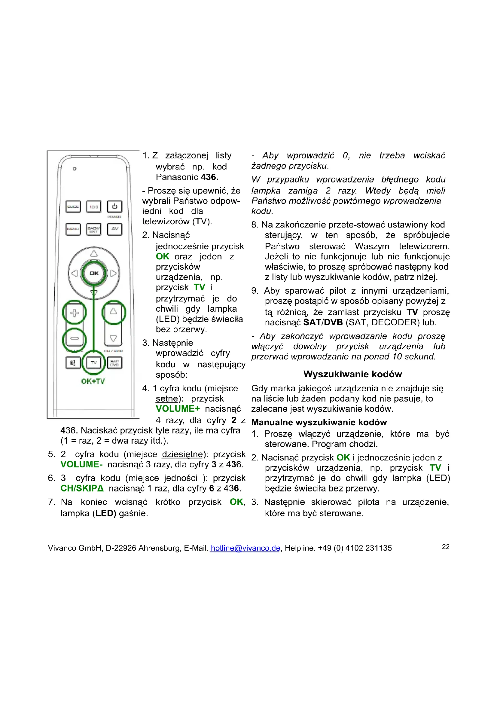 ustawiony kod sterujący. Gdy nie funkcjonuje on prawidłowo, to proszę spróbować powtórnie wyszukiwania kodów. Wyszukiwanie kodów zaczyna się wtedy z następnym kolejnym kodem. Identyfikacja kodów Ustawiony 3-cyfrowy kod możecie Państwo w Vivanco GmbH, D-22926 Ahrensburg, E-Mail: hotline@vivanco.de, Helpline: +49 (0) 4102 231135 23każdej chwili wyczytać: