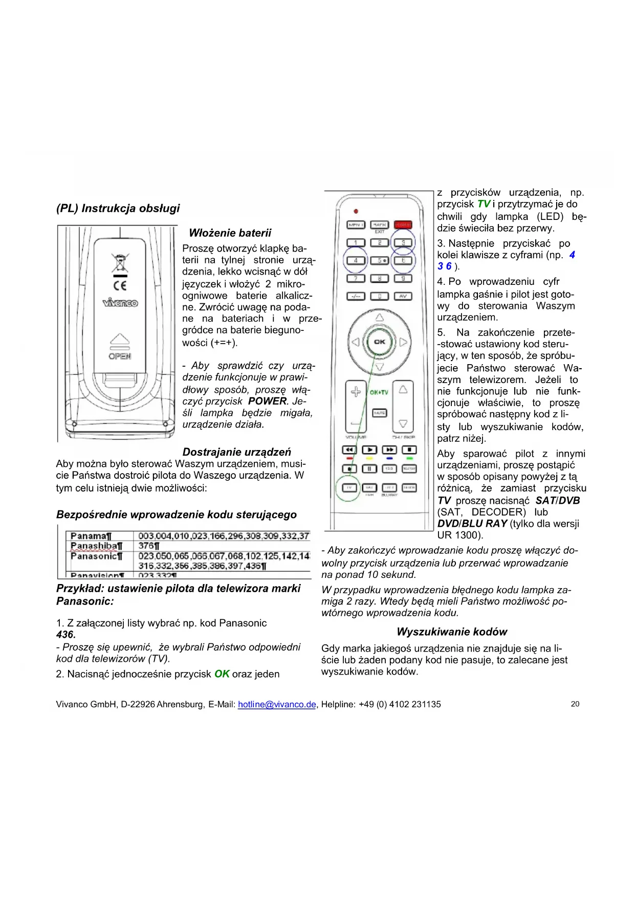 -stować ustawiony kod steru- jący, w ten sposób, że spróbu- jecie Państwo sterować Wa- szym telewizorem. Jeżeli to nie funkcjonuje lub nie funk- cjonuje właściwie, to proszę spróbować następny kod z li- sty lub wyszukiwanie kodów, patrz niżej. Aby sparować pilot z innymi urządzeniami, proszę postąpić w sposób opisany powyżej z tą różnicą, że zamiast przycisku TV proszę nacisnąć SAT/DVB (SAT, DECODER) lub DVD/BLU RAY (tylko dla wersji UR 1300). - Aby zakończyć wprowadzanie kodu proszę włączyć do- wolny przycisk urządzenia lub przerwać wprowadzanie na ponad 10 sekund. W przypadku wprowadzenia błędnego kodu lampka za- miga 2 razy. Wtedy będą mieli Państwo możliwość po- wtórnego wprowadzenia kodu. Wyszukiwanie kodów Gdy marka jakiegoś urządzenia nie znajduje się na li- ście lub żaden podany kod nie pasuje, to zalecane jest wyszukiwanie kodów. Vivanco GmbH, D-22926 Ahrensburg, E-Mail: hotline@vivanco.de, Helpline: +49 (0) 4102 231135 20Manualne wyszukiwanie kodów