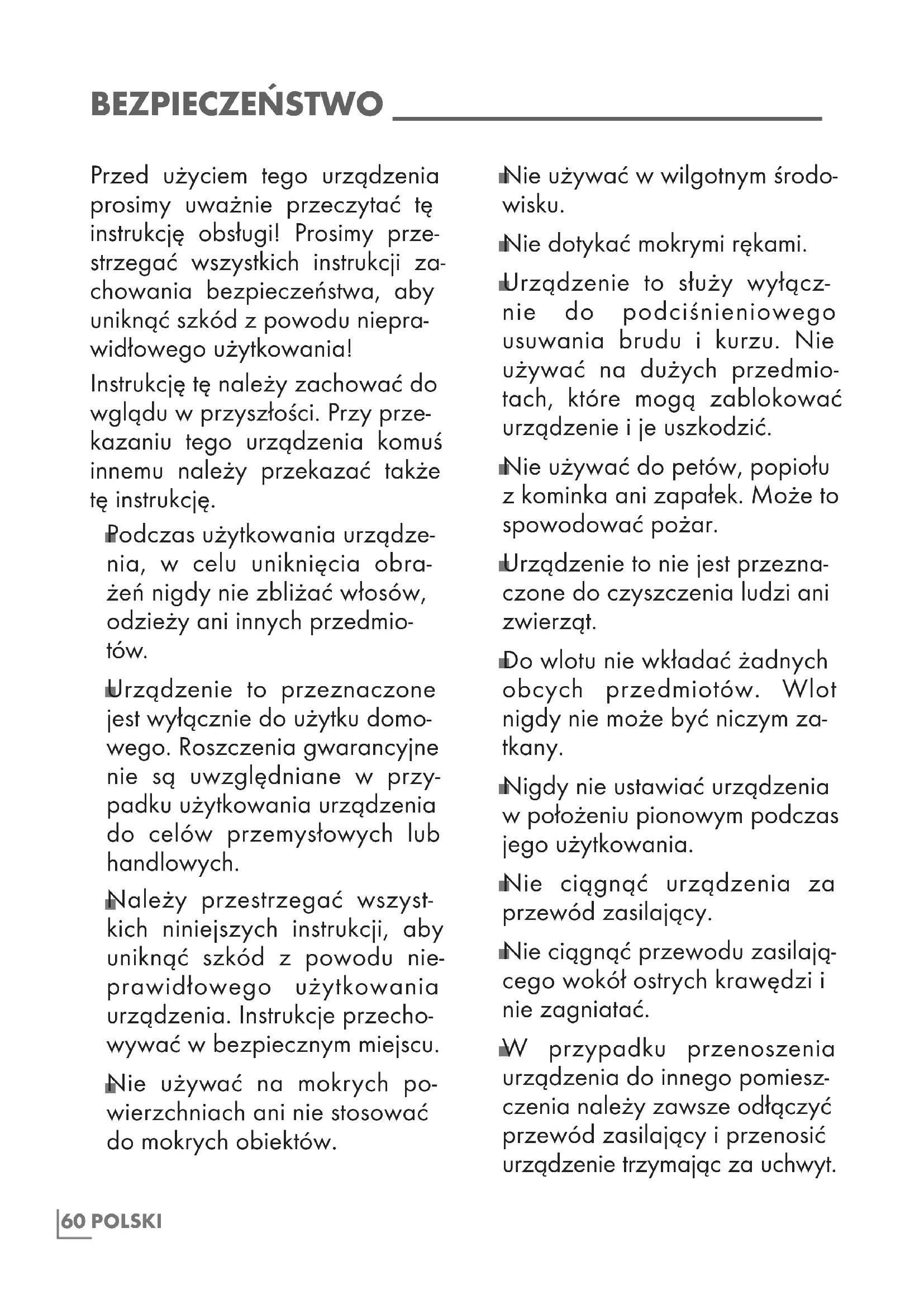 W przypadku przenoszenia urządzenia do innego pomiesz- czenia należy zawsze odłączyć przewód zasilający i przenosić urządzenie trzymając za uchwyt.61POLSKI