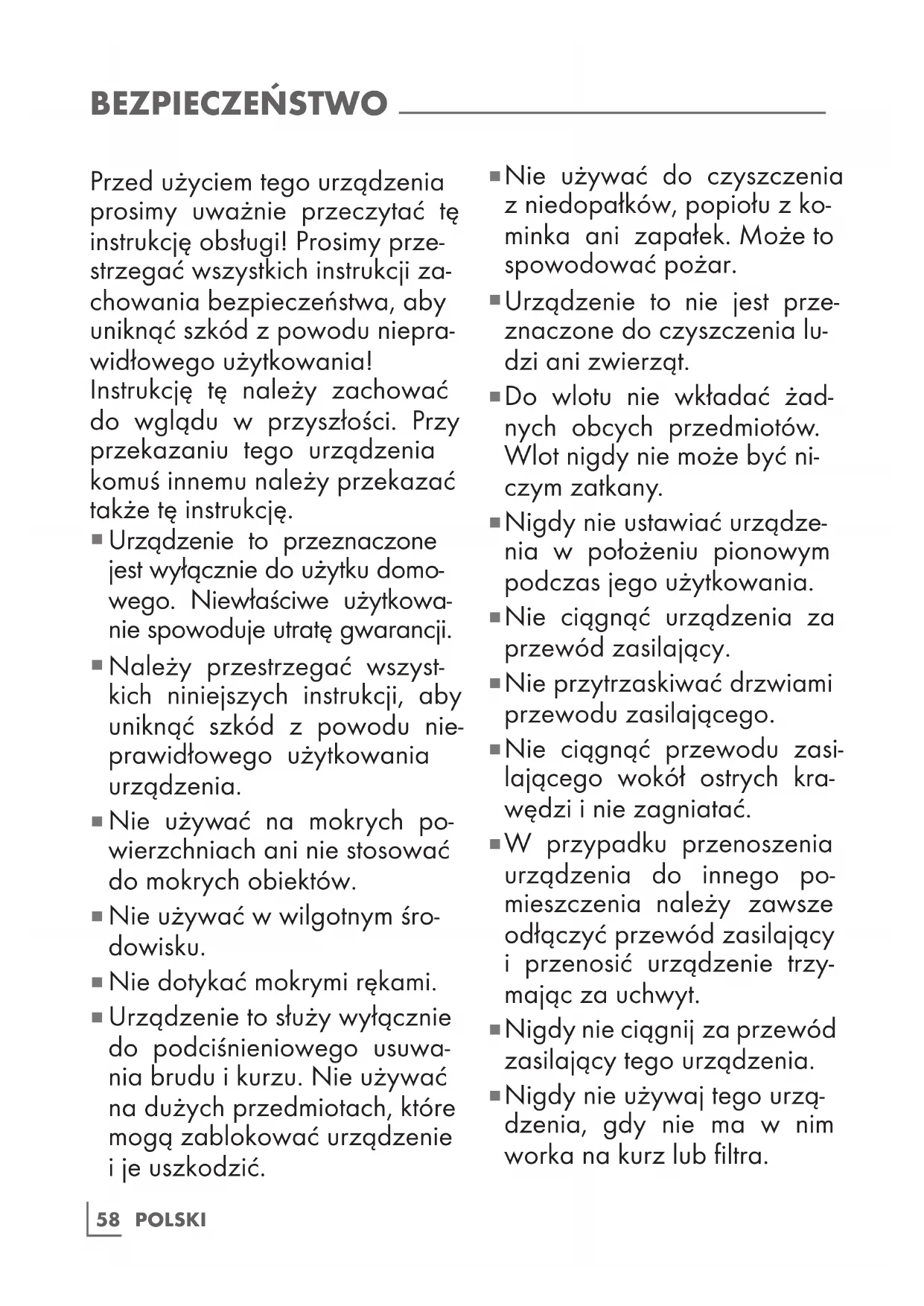 Nigdy nie używaj tego urzą- dzenia, gdy nie ma w nim worka na kurz lub filtra.POLSKI 59 BEZPIECZEŃSTWO