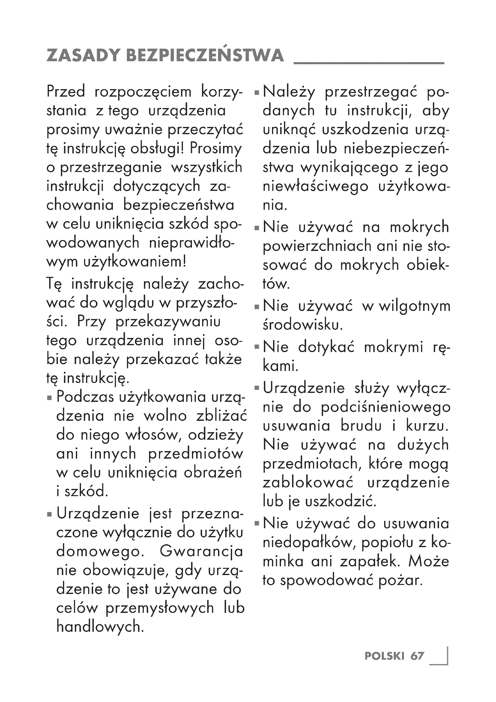 Urządzenie służy wyłącz- nie do podciśnieniowego usuwania brudu i kurzu. Nie używać na dużych przedmiotach, które mogą zablokować urządzenie lub je uszkodzić.