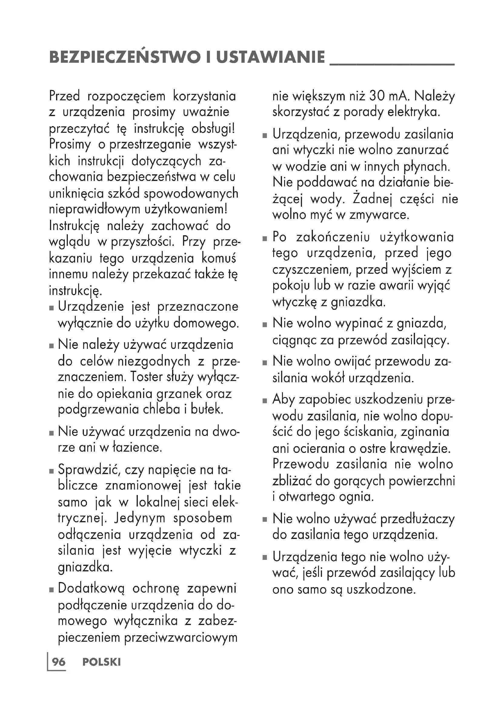 Nie należy używać urządzenia do celów niezgodnych z prze- znaczeniem. Toster służy wyłącz- nie do opiekania grzanek oraz podgrzewania chleba i bułek.