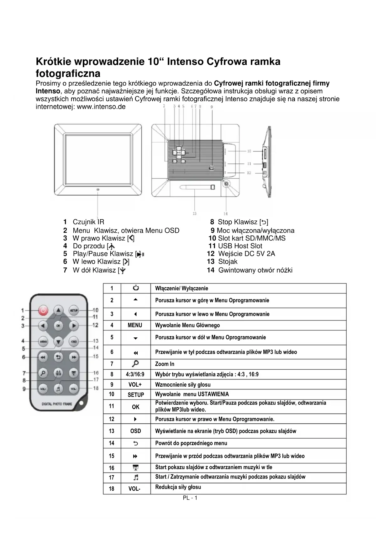 Os aparelhos que vêm marcados com este símbolo estão sujeitos às normas européias 2002/96/EC. Todos os aparelhos elétricos e eletrodomésticos devem ser separados do lixo caseiro e depositados em lugares próprios, determinados pelo estado. Com a eliminação correta de aparelhos eletrodomésticos podem ser evitados danos no meio ambiente.PL - 1 Krótkie wprowadzenie 10“ Intenso Cyfrowa ramka fotograficzna Prosimy o prześledzenie tego krótkiego wprowadzenia do Cyfrowej ramki fotograficznej firmy Intenso, aby poznać najważniejsze jej funkcje. Szczegółowa instrukcja obsługi wraz z opisem wszystkich możliwości ustawień Cyfrowej ramki fotograficznej Intenso znajduje się na naszej stronie internetowej: www.intenso.de