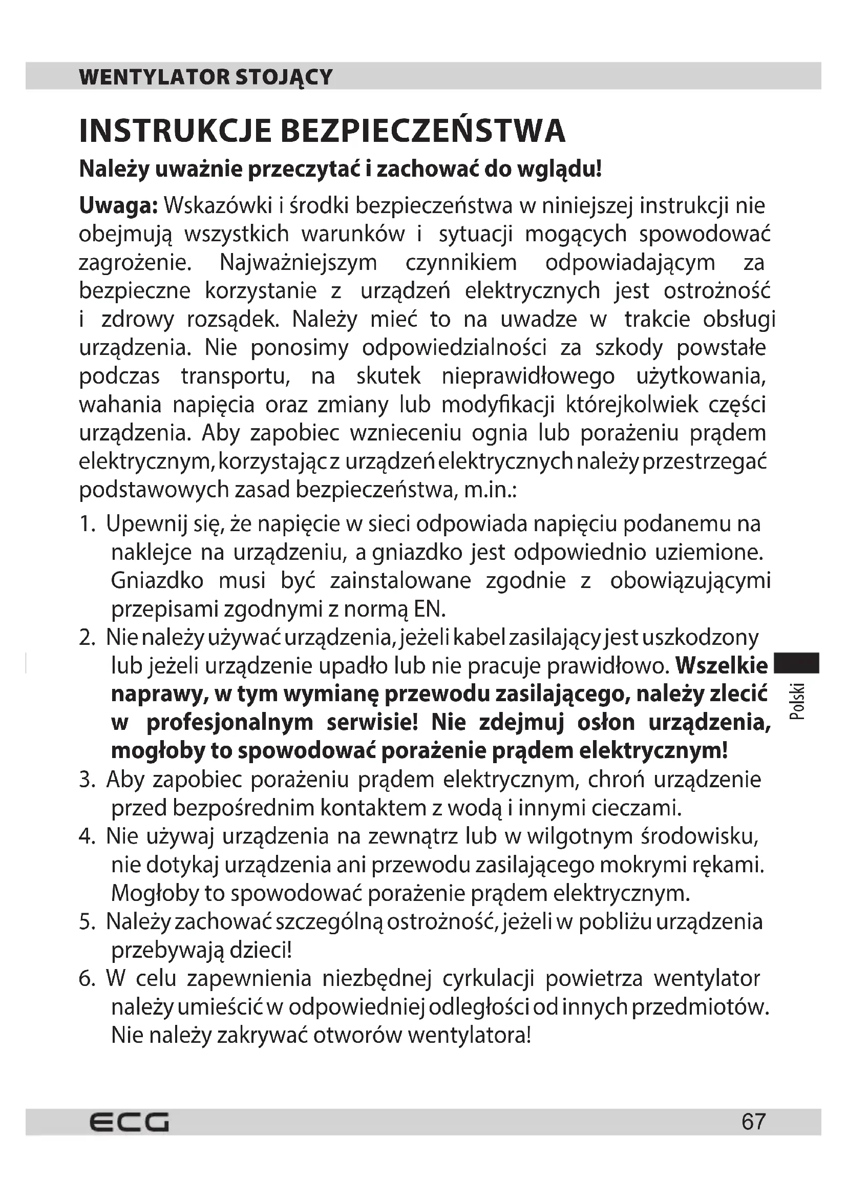 Należy uważnie przeczytać izachować do wglądu! Uwaga: Wskazówki iśrodki bezpieczeństwa wniniejszej instrukcji nie obejmują wszystkich warunków i sytuacji mogących spowodować zagrożenie. Najważniejszym czynnikiem odpowiadającym za bezpieczne korzystanie z urządzeń elektrycznych jest ostrożność i zdrowy rozsądek. Należy mieć to na uwadze w trakcie obsługi urządzenia. Nie ponosimy odpowiedzialności za szkody powstałe podczas transportu, na skutek nieprawidłowego użytkowania, wahania napięcia oraz zmiany lub modykacji którejkolwiek części urządzenia. Aby zapobiec wznieceniu ognia lub porażeniu prądem elektrycznym, korzystając zurządzeń elektrycznych należy przestrzegać podstawowych zasad bezpieczeństwa, m.in.: