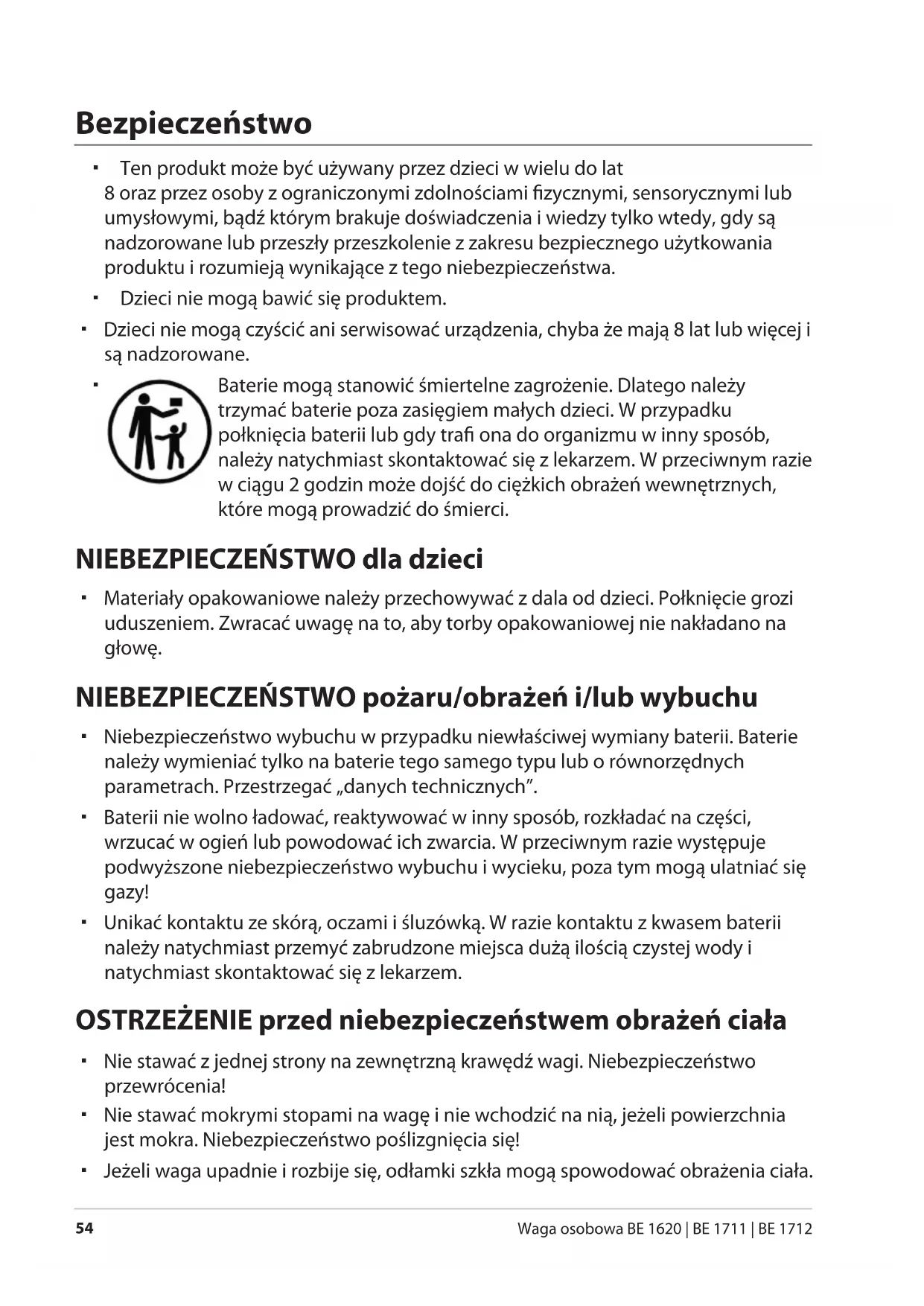 Waga osobowa BE 1620 | BE 1711 | BE 1712 Bezpieczeństwo Ten produkt może być używany przez dzieci w wielu do lat 8 oraz przez osoby z ograniczonymi zdolnościami fizycznymi, sensorycznymi lub umysłowymi, bądź którym brakuje doświadczenia i wiedzy tylko wtedy, gdy są nadzorowane lub przeszły przeszkolenie z zakresu bezpiecznego użytkowania produktu i rozumieją wynikające z tego niebezpieczeństwa. Dzieci nie mogą bawić się produktem. Dzieci nie mogą czyścić ani serwisować urządzenia, chyba że mają 8 lat lub więcej i są nadzorowane.