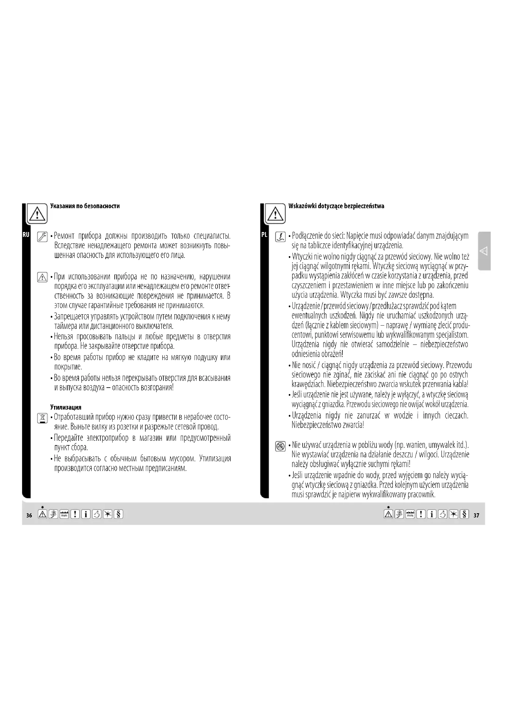 - Urządzenia nigdy nie zanurzać w wodzie i innych cieczach. Niebezpieczeństwo zwarcia! Указания по безопасности