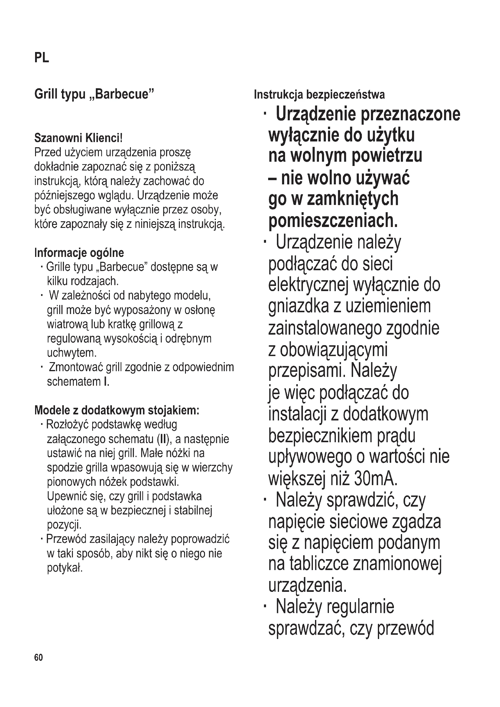 bezpieczeństwo użytkownika. ∙ W czasie pracy, urządzenie musi być umieszczone na powierzchni odpornej na wysokie temperatury, plamy i rozgrzany tłuszcz. Podczas opiekania żywności z dużą zawartością tłuszczu nie zawsze można uniknąć odprysków. ∙ Nie stawiać grilla w rogu, ani nie opierać go o ścianę. Upewnić się, czy w pobliżu nie znajdują się żadne materiały łatwopalne. ∙ Żywność z dużą zawartością tłuszczu może się zapalić; dlatego przed każdym użyciem urządzenia zawsze należy napełnić komorę grilla wodą. Nie podłączać grilla do sieci elektrycznej przed napełnieniem komory grilla wodą. ∙ Woda pomaga ochłodzić komorę grilla, zapobiega nadmiernemu dymieniu i ułatwia późniejsze czyszczenie. ∙ Podczas używania urządzenia poziom wody w komorze grilla zawsze musi znajdować się pomiędzy oznaczeniami Min. i Max. – Wskaźnik poziomu wody - Minimum – Wskaźnik poziomu wody - Maximum Poziom wody powinien zawsze utrzymywać się powyżej oznaczenia „Min”. Wodę należy dolewać z odpowiednim wyprzedzeniem, pamiętając, aby nie zetknęła się ona z elementem grzejnym. Ostrzeżenie: Przed przystąpieniem do dolewania wody, odłączyć grilla od zasilania. ∙ Każdorazowo przed użyciem grilla sprawdzić, czy element grzejny jest prawidłowo włożony do komory grilla i obudowy. Przycisk bezpieczeństwa aktywuje się automatycznie, jeśli element grzewczy został prawidłowo założony. W przeciwnym przypadku urządzenia nie będzie można włączyć. ∙ Nie pozostawiać włączonego urządzenia bez nadzoru. ∙ Należy pamiętać, że podczas pracy urządzenia obudowa, element grzejny oraz kratka osiągają bardzo wysokie temperatury. Nie dotykać elementu grzejnego nawet po wyłączeniu. Odczekać aż ostygnie – w przeciwnym razie istnieje poważne niebezpieczeństwo oparzenia. ∙ Należy uważać, aby przewód zasilający nie dotykał żadnych gorących elementów. ∙ Wtyczkę należy wyjmować z gniazdka każdorazowo: - przed dolewaniem wody do komory grilla; - po zakończeniu pracy; - w przypadku stwierdzenia awarii urządzenia; - i przed przystąpieniem do czyszczenia. ∙ Stosowanie przedłużacza w szpuli może spowodować przerwy w przepływie prądu i możliwość przegrzanie się przewodu. Dlatego bezwzględnie należy rozwijać cały przedłużacz. Sprawdzić, czy przedłużacz jest przeznaczony do użytku na zewnątrz wg informacji producenta. ∙ Ostrzeżenie: Nie przenosić grilla, kiedy jest używany. Przed przenoszeniem, przewożeniem i składaniem grilla, upewnić się, czy już odpowiednio ostygł.64 104 x 142 mm Po użyciu grilla wylać pozostałą w nim wodę. ∙ Grilla nie należy przechowywać na zewnątrz ani w innym miejscu, w którym byłby on narażony na skrajne temperatury lub wysoki poziom wilgoci. ∙ Za szkody wynikłe z nieprawidłowego używania sprzętu lub użytkowania niezgodnego z instrukcją obsługi odpowiedzialność ponosi wyłącznie użytkownik. ∙ Grill typu „Barbecue” przeznaczony jest do użytku domowego, a nie przemysłowego. ∙ Niniejszy wyrób zgodny jest z obowiązującymi w UE przepisami dotyczącymi oznakowania produktu. Element grzejny Puszka przyłączeniowa zawiera przycisk bezpieczeństwa. Włożyć element grzejny do komory grilla. Przycisk bezpieczeństwa aktywuje się automatycznie, jeśli element grzejny został prawidłowo założony. W przeciwnym przypadku urządzenie się nie włączy. Przed użyciem urządzenia po raz pierwszy ∙ Zdjąć z urządzenia wszystkie elementy opakowania i naklejki. ∙ Umyć kratkę i komorę grilla w ciepłej wodzie z detergentem, po czym dokładnie wytrzeć do sucha. Składanie grilla: ∙ Włożyć element grzejny do komory grilla. ∙ Na górze umieścić kratkę. ∙ W razie potrzeby można zamontować dodatkowe akcesoria, zgodnie ze schematem. ∙ Napełnić komorę grilla wodą do oznaczenia „Max”. ∙ Włożyć wtyczkę do gniazdka elektrycznego. ∙ Rozgrzewać grill przez około 10 minut bez żywności na kratce grilla. Dzięki temu pozbywamy się charakterystycznego zapachu, który wydobywa się przy pierwszym włączeniu nowego grilla (ponieważ może wydobywać się także dym). Grillowanie ∙ Napełnić komorę grilla wodą do oznaczenia „Max”. ∙ Umieścić kratkę w komorze grilla. ∙ Modele z kratką z regulowaną wysokością: Przygotowując delikatne produkty umieścić kratkę grilla na najwyższym poziomie. ∙ Włożyć wtyczkę do gniazdka elektrycznego. ∙ Przekręcić gałkę termostatu do końca w kierunku zgodnym z ruchem wskazówek zegara. Zapali się wskaźnik świetlny i element grzejny włączy się. ∙ Po około 10 minutach element grzejny osiągnie temperaturę odpowiednią do grillowania. ∙ Grill może także służyć do utrzymywania wysokiej temperatury dania: kiedy gałka104 x 142 mm