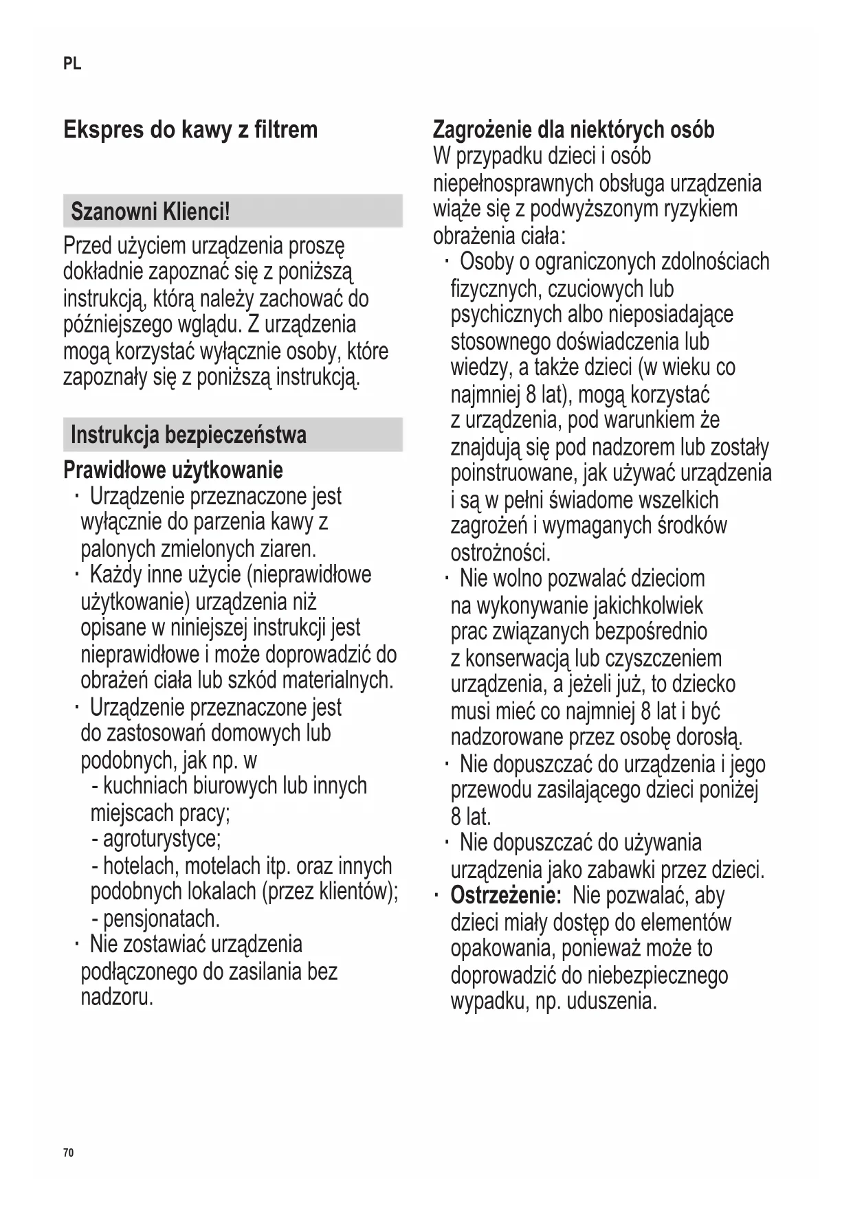 ∙ Osoby o ograniczonych zdolnościach zycznych, czuciowych lub psychicznych albo nieposiadające stosownego doświadczenia lub wiedzy, a także dzieci (w wieku co najmniej 8 lat), mogą korzystać z urządzenia, pod warunkiem że znajdują się pod nadzorem lub zostały poinstruowane, jak używać urządzenia i są w pełni świadome wszelkich zagrożeń i wymaganych środków ostrożności. ∙ Nie wolno pozwalać dzieciom na wykonywanie jakichkolwiek prac związanych bezpośrednio z konserwacją lub czyszczeniem urządzenia, a jeżeli już, to dziecko musi mieć co najmniej 8 lat i być nadzorowane przez osobę dorosłą. ∙ Nie dopuszczać do urządzenia i jego przewodu zasilającego dzieci poniżej 8 lat. ∙ Nie dopuszczać do używania urządzenia jako zabawki przez dzieci. ∙ Ostrzeżenie: Nie pozwalać, aby dzieci miały dostęp do elementów opakowania, ponieważ może to doprowadzić do niebezpiecznego wypadku, np. uduszenia. PL71 142 x 208 mm Niebezpieczeństwo porażenia prądem Urządzenie jest zasilane prądem elektrycznym, zatem zawsze stwarza zagrożenie porażenia prądem. W związku z powyższym należy zachowywać następujące środki ostrożności: ∙ Przed użyciem należy dokładnie sprawdzić, czy główny korpus urządzenia i wszystkie elementy czynnościowe są sprawne i nie noszą śladów uszkodzenia. Jeżeli urządzenie np. spadło na twardą powierzchnię albo przewód zasilający został narażony na zbyt silne szarpnięcie, nie nadaje się ono do dalszego użytku: nawet najmniejsza, niewidoczna usterka powstała z tego powodu, może mieć ujemny wpływ na działanie urządzenia i bezpieczeństwo użytkownika. ∙ Urządzenie należy podłączyć do sieci elektrycznej wyłącznie do gniazdka zainstalowanego zgodnie z przepisami. Należy sprawdzić, czy napięcie sieciowe zgadza się z napięciem podanym na tabliczce znamionowej urządzenia. ∙ Wtyczkę należy wyjąć z gniazda elektrycznego - po zakończeniu pracy; - w przypadku awarii urządzenia; - przed przystąpieniem do czyszczenia urządzenia. ∙ Wyjmując wtyczkę z gniazdka nigdy nie należy szarpać za przewód. ∙ Nie chwytać wtyczki mokrymi dłońmi. ∙ Nie zanurzać urządzenia w wodzie ani innej cieczy, nie myć go pod bieżącą wodą. Niebezpieczeństwo oparzenia Urządzenie podgrzewa wodę i utrzymuje jej wysoką temperaturę. Zewnętrzne powierzchnie, dzbanek i płyta grzewcza rozgrzewają się do wysokiej temperatury podczas pracy urządzenia i pozostają gorące jeszcze przez jakiś czas po zakończeniu pracy. Istnieje zatem niebezpieczeństwo oparzenia. ∙ Nie należy zatem dotykać tych elementów w trakcie pracy urządzenia i po jej zakończeniu należy najpierw odczekać, aż ostygną. ∙ Nie otwierać ani nie odchylać pojemnika z wyjmowanym ltrem podczas pracy urządzenia. ∙ Po zakończeniu pracy urządzenia i przed otwarciem odchylanego pojemnika na ltr lub dolaniem świeżej wody, zawsze odczekać przez około 5 minut, aż urządzenie ostygnie. Higiena Brak odpowiedniej higieny może doprowadzić do pojawienia się w urządzeniu drobnoustrojów: ∙ Urządzenie należy dokładnie umyć przed pierwszym użyciem. ∙ Przed przystąpieniem do czyszczenia, należy sprawdzić, czy urządzenie zupełnie ostygło i jest wyłączone z sieci elektrycznej. ∙ Wyjmowany ltr i dzbanek należy myć codziennie. ∙ Nie należy zostawiać wody w pojemniku. ∙ Urządzenie należy regularnie72 142 x 208 mm odkamieniać. ∙ Szczegółowe informacje nt. czyszczenia urządzenia znajdują się w punkcie Czyszczenie i konserwacja. Niebezpieczeństwo uszkodzenia urządzenia Nieprawidłowa obsługa urządzenia może spowodować jego uszkodzenie