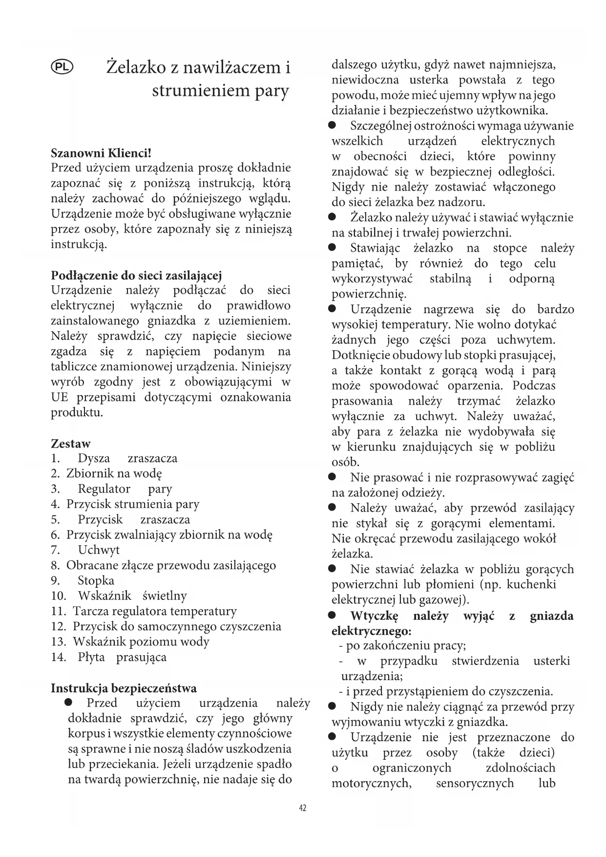 Instrukcja bezpieczeństwa Przed użyciem urządzenia należy dokładnie sprawdzić, czy jego główny korpus i wszystkie elementy czynnościowe są sprawne i nie noszą śladów uszkodzenia lub przeciekania. Jeżeli urządzenie spadło na twardą powierzchnię, nie nadaje się do dalszego użytku, gdyż nawet najmniejsza, niewidoczna usterka powstała z tego powodu, może mieć ujemny wpływ na jego działanie i bezpieczeństwo użytkownika. Szczególnej ostrożności wymaga używanie wszelkich urządzeń elektrycznych w obecności dzieci, które powinny znajdować się w bezpiecznej odległości. Nigdy nie należy zostawiać włączonego do sieci żelazka bez nadzoru. Żelazko należy używać i stawiać wyłącznie na stabilnej i trwałej powierzchni. Stawiając żelazko na stopce należy pamiętać, by również do tego celu wykorzystywać stabilną i odporną powierzchnię. Urządzenie nagrzewa się do bardzo wysokiej temperatury. Nie wolno dotykać żadnych jego części poza uchwytem. Dotknięcie obudowy lub stopki prasującej, a także kontakt z gorącą wodą i parą może spowodować oparzenia. Podczas prasowania należy trzymać żelazko wyłącznie za uchwyt. Należy uważać, aby para z żelazka nie wydobywała się w kierunku znajdujących się w pobliżu osób. Nie prasować i nie rozprasowywać zagięć na założonej odzieży. Należy uważać, aby przewód zasilający nie stykał się z gorącymi elementami. Nie okręcać przewodu zasilającego wokół żelazka. Nie stawiać żelazka w pobliżu gorących powierzchni lub płomieni (np. kuchenki elektrycznej lub gazowej). Wtyczkę należy wyjąć z gniazda elektrycznego: - po zakończeniu pracy; - w przypadku stwierdzenia usterki urządzenia; - i przed przystąpieniem do czyszczenia. Nigdy nie należy ciągnąć za przewód przy wyjmowaniu wtyczki z gniazdka. Urządzenie nie jest przeznaczone do użytku przez osoby (także dzieci) o ograniczonych zdolnościach motorycznych, sensorycznych lub