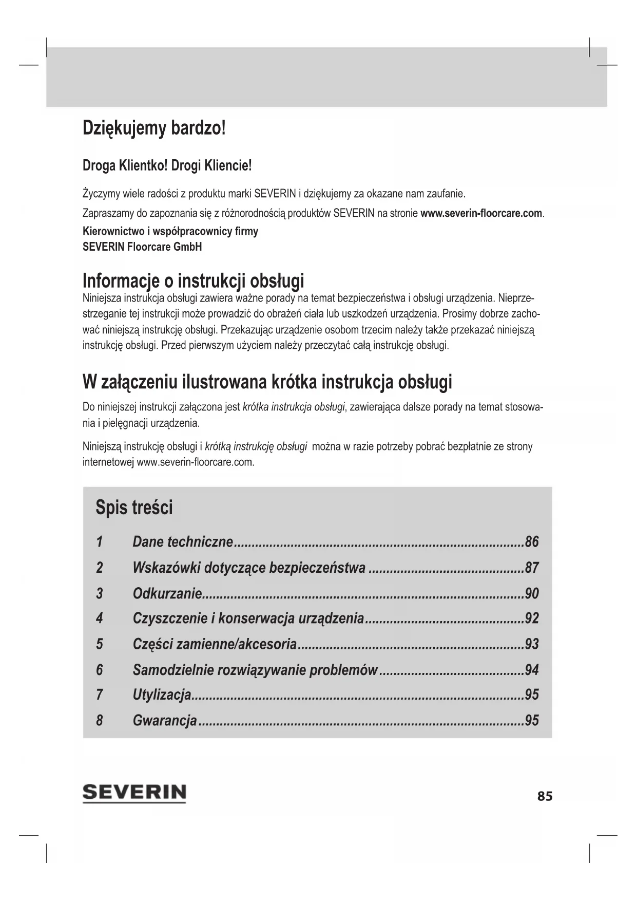 Ochłodzony odkurzacz można ponownie włączyć. Odkurzacz prawie wcale nie zbiera zanieczyszczeń lub widoczny jest wyraźny spadek mocy ssania Trzeba wymienić worek na kurz („Wymiana worka na kurz” na stro- nie 91). Zaleca się, aby przy tej okazji także wyczyścić ltry („Czyszczenie ltra silnika” na stronie 92, „Czyszczenie ltra wydmuchowego” na stronie 92). Być może ustawiona moc ssania nie jest odpowiednia do odkurzanej wykładziny podłogowej. Ustawić prawidłową moc ssania („Ustawianie mocy ssania” na stro- nie 91).95 uTylizacja Problem Przyczyna/usuwanie Urządzenie prawie nie zbiera zanieczyszczeń lub widoczny jest wyraźny spadek mocy ssania Być może założona dysza nie jest odpowiednia do odkurzanej wykładzi- ny podłogowej. Wybrać i założyć prawidłową dyszę. Dysza podłogowa jest założona, ale przełącznik „dywan/twarda podłoga” znajduje się w nieodpowiednim położeniu do wykładziny. Wybrać właściwe położenie przełącznika. Nie można zamknąć pokrywy urządzenia Worek na kurz wystaje i uniemożliwia całkowite zamknięcie pokrywy. W tym przypadku dokładnie włożyć cały worek do urządzenia. Jeśli ta tabela nie pomoże, proszę zwrócić się do naszego serwisu. Dane kontaktowe znajdują się w załączni- ku do niniejszej instrukcji obsługi lub na stronie www.severin.de. 7 Utylizacja Urządzeń oznakowanych tym symbolem nie wolno utylizować z odpadami domowymi. Te urzą- dzenia zawierają cenne surowce, które można ponownie wykorzystać. Należyta utylizacja chroni środowisko i zdrowie ludzi. Informacji na temat właściwej utylizacji można zasięgnąć w urzędzie gminy lub w sklepie specjalistycznym. 8 Gwarancja Poniższe warunki gwarancji nie naruszają ustawowych praw do świadczeń z tytułu rękojmi wobec sprzedawcy oraz ewentualnych gwarancji sprzedawcy. Jeśli wymagana jest naprawa, należy skontaktować się telefonicznie lub mailowo z naszym serwisem. Dane kontaktowe znajdują się w załączniku do niniejszej instrukcji obsługi. W przypadku objętym gwarancją można alternatywnie zwrócić się także bezpośrednio do sprzedawcy. Dodatkowo SEVERIN udziela gwarancji producenta na dwa lata od daty zakupu. W tym okresie bezpłatnie usuwamy wszelkie wady, przy których udowodnione jest, że spowodowane są błędami materiałowymi lub produkcyjnymi i w znaczny sposób pogarszają działanie. Dalsze roszczenia są wykluczone. Gwarancją nie są objęte: szkody wynikłe z nieprzestrzegania instrukcji obsługi, niewłaściwego obchodzenia się lub normalnego zużycia, a także kruche części, takie jak szkło, tworzywo sztuczne czy żarówki. Gwarancja wygasa w razie manipulacji dokonywanych przez nieautoryzowane przez SEVERIN placówki.96