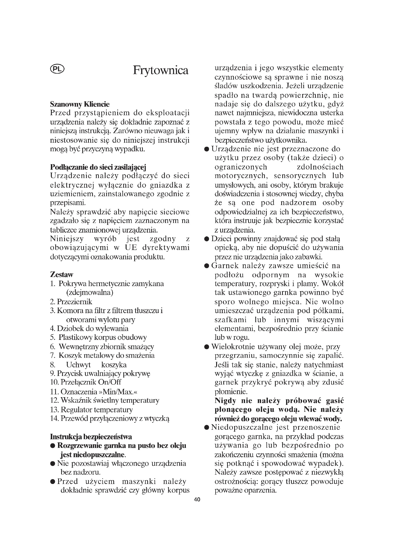 Frytownica ● Uwaga: pewne części urządzenia rozgrzewają się do bardzo wysokich temperatur a przez pokrywę może wydobywać się gorąca para. Obsługa frytownicy wymaga więc wielkiej ostrożności. ● Nie należy palcami dotykać rozgrzanego tłuszczu. ● Do rozgrzanego oleju nie należy wkładać żadnych plastikowych sztućców, jak również wylewać gorącego tłuszczu do naczyń z tworzywa sztucznego. ● Należy regularnie sprawdzać, czy przewód przyłączeniowy nie jest uszkodzony. W przypadku jakiegokolwiek uszkodzenia przewodu, należy natychmiast zaprzestać używania urządzenia. ● Przewód przyłączeniowy nie powinien zwisać wolno, należy uważać aby znajdował się w bezpiecznej odległości od gorących części urządzenia. ● Wtyczkę należy uprzednio wyjąć z gniazda elektrycznego: - w przypadku awarii urządzenia - po zakończeniu pracy - przed przystąpieniem do czyszczenia urządzenia. ● Urządzenie nie jest przystosowane do bycia uruchamianym przy użyciu zewnętrznego czasomierza lub odrębnego systemu zdalnego sterowania. ● Nie ponosi się odpowiedzialności, jeżeli szkoda wynikła z nieprawidłowego używania garnka lub użytkowania niezgodnego z instrukcją obsługi. ● Niniejszy garnek do smażenia w oleju jest przeznaczony wyłącznie do użytku domowego a nie komercjalnego. ● Zgodnie z regulaminem bezpieczeństwa i w celu uniknięcia ryzyka, wszelkie naprawy urządzeń elektrycznych muszą być dokonywane przez fachowy i upoważniony do tego personel. Dotyczy to również wymiany przewodu przyłączeniowego. Napraw należy dokonywac w autoryzowanych zakładach serwisowych. Adresy serwisów znajdują się na ulotce lub karcie gwarancyjnej w języku polskim. Elementy czynnościowe Pokrywa (1) Otwieramy pokrywę przyciskiem uwalniającym. Mechanizm sprężynowy sprawia, że pokrywa podnosi się automatycznie zaraz po naciśnięciu przycisku. Zamykamy pokrywę ruchem przyciskającym w dół, aż usłyszymy dźwięk zatrzaśnięcia się w odpowiednich miejscach. Pokrywę można zdejmować do czyszczenia wtedy, kiedy po otwarciu znajdzie się ona w pozycji pionowej. Wyjmujemy ją przez pociągnięcie do góry. Przeziernik (2) Okienko, znajdujące się w pokrywie, pozwala nam obserwować przebiegający proces smażenia. Aby przeziernik się nie zaparował, należy szybkę przetrzeć olejem od wewnątrz. Wewnętrzny zbiornik smażący (6) W czasie rozgrzewania się garnka poziom oleju w zbiorniku powinien zawierać się pomiędzy oznaczeniami: minimum i maksimum, które widoczne są wewnątrz tego zbiornika. Maksymalne wypełnienie równa się ilości ok. 1,5 litrów. Przed wypełnieniem zbiornika odpowiednią ilością oleju należy wyjąć z niego koszyk do smażenia. Koszyk do smażenia (7) Koszyk ten przeznaczony jest na artykuły żywnościowe do smażenia. Po umieszczeniu metalowego koszyka we wnętrzu frytownicy i po zamknięciu pokrywy możemy koszyk zanurzyć w gorącym oleju od zewnątrz, posługując się zintegrowanym mechanizmem zewnętrznej rączki koszyka. Zanurzamy koszyk przycisnąwszy guzik znajdujący się na rączce, jednocześnie przesuwając ją w dół. Aby podnieść koszyk z gorącego oleju, należy przesuwać rączkę do 41góry aż się zatrzaśnie w pozycji poziomej. Wskaźnik świetlny temperatury (12) Wskaźnik świetlny temperatury wyłączy się automatycznie w momencie kiedy urządzenie osiągnie nastawioną temperaturę. Kiedy spadnie ona poniżej żądanego poziomu, wskaźnik świetlny na powrót się włączy i rozpocznie się proces grzania. Regulator temperatury (13) Gałką regulatora temperatury wybieramy odpowiedni poziom grzania. Przed użyciem garnka po raz pierwszy Przed użyciem frytownicy po raz pierwszy, należy wyczyścić wnętrze smażące frytownicy jak również wewnętrzną powierzchnię pokrywy. Do czyszczenia używamy lekko zwilżonej ściereczki. Należy pamiętać że urządzenie musi być w tym czasie wyłączone z sieci. Wyjmujemy także metalowy koszyk i myjemy go dokładnie w gorącej wodzie. Aby nie dopuścić do kontaktu wody z olejem, należy starannie osuszyć wszystkie oczyszczone części, dopiero potem naleć do garnka około 1,5 litrów oleju roślinnego. Instrukcja obsługi