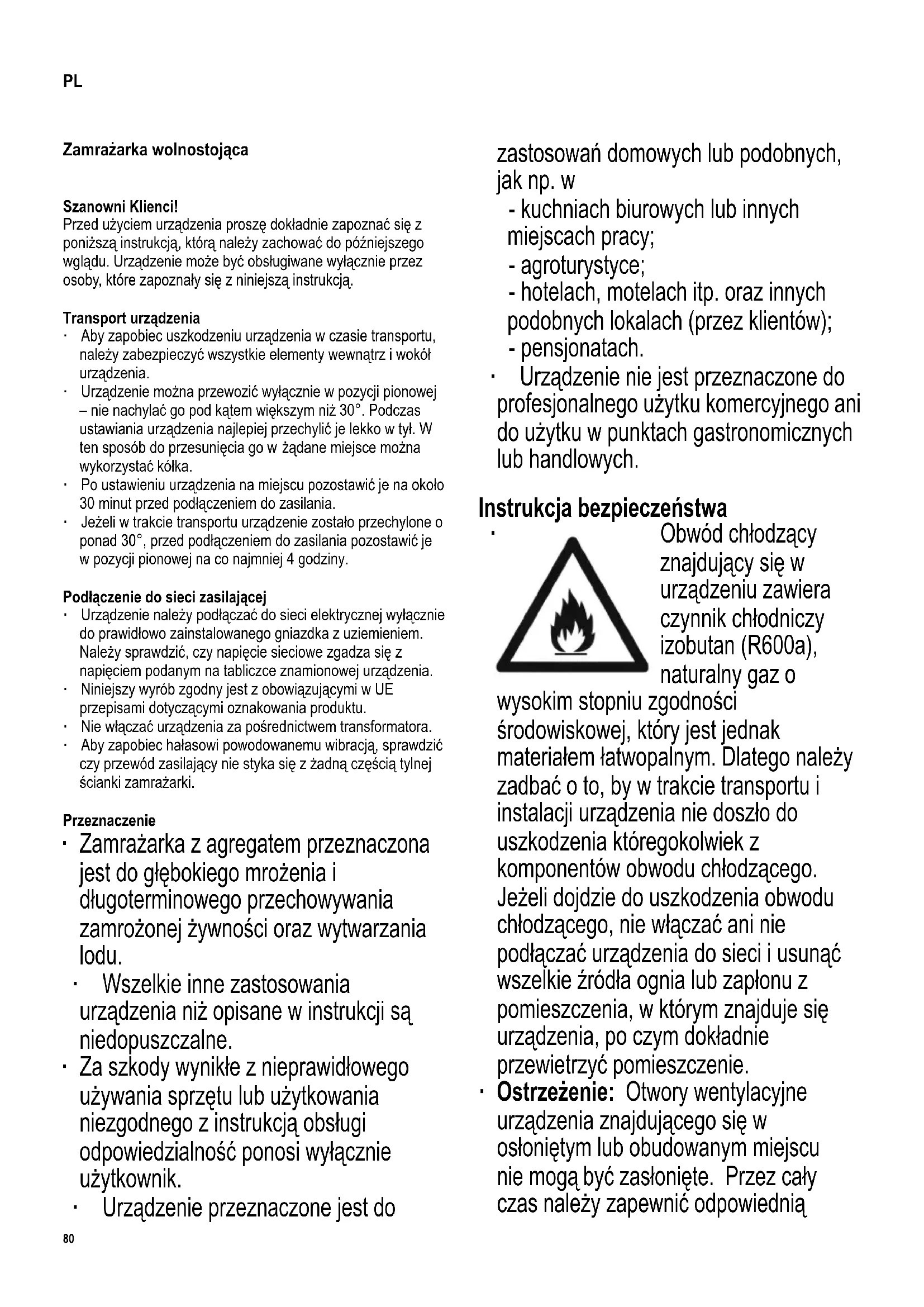 Obwód chłodzący znajdujący się w urządzeniu zawiera czynnik chłodniczy izobutan (R600a), naturalny gaz o wysokim stopniu zgodności środowiskowej, który jest jednak materiałem łatwopalnym. Dlatego należy zadbać o to, by w trakcie transportu i instalacji urządzenia nie doszło do uszkodzenia któregokolwiek z komponentów obwodu chłodzącego. Jeżeli dojdzie do uszkodzenia obwodu chłodzącego, nie włączać ani nie podłączać urządzenia do sieci i usunąć wszelkie źródła ognia lub zapłonu z pomieszczenia, w którym znajduje się urządzenia, po czym dokładnie przewietrzyć pomieszczenie. ∙ Ostrzeżenie: Otwory wentylacyjne urządzenia znajdującego się w osłoniętym lub obudowanym miejscu nie mogą być zasłonięte. Przez cały czas należy zapewnić odpowiednią PL81 wentylację. ∙ Ostrzeżenie: Nie dopuszczać do uszkodzenia obwodu chłodzącego. Opary ulatniającego się czynnika chłodniczego są szkodliwe dla oczu, a ponadto istnieje zagrożenie zapalenia się gazu. ∙ Ostrzeżenie: Nie używać żadnych zewnętrznych urządzeń (jak np. nagrzewnice) w celu przyśpieszenia procesu rozmrażania; stosować wyłącznie metody zalecane w niniejszej instrukcji. ∙ Ostrzeżenie: Nie używać żadnych innych urządzeń elektrycznych (np. maszyny do robienia lodu) wewnątrz zamrażarki, chyba że niniejsza instrukcja wyraźnie mówi inaczej. ∙ Przed podłączeniem urządzenia do sieci należy dok ładnie sprawdzić, czy nie zostało ono – w tym także przewód zasilający – uszkodzone podczas transportu. W przypadku stwierdzenia jakiegokolwiek uszkodzenia, nie wolno podłączać urządzenia do zasilania. ∙ Urządzenie nie jest przeznaczone do przechowywania substancji wybuchowych, jak np. pojemniki z palnym aerozolem. ∙ W przypadku sprzedaży, przekazania osobie trzeciej lub utylizacji urządzenia w przeznaczonym do tego miejscu, należy zwrócić uwagę na obecność czynnika izolującego cyklopentan oraz chłodniczego R600a. Więcej informacji o prawidłowym sposobie zutylizowania produktu można znaleźć w punkcie Utylizacja. ∙ Zgodnie z zasadami bezpieczeństwa oraz w celu uniknięcia wszelkiego ryzyka, naprawy urządzeń elektrycznych powinien dokonywać wykwalifi kowany personel, co dotyczy także wymiany przewodu przyłączeniowego. ∙ Osoby o ograniczonych zdolnościach fi zycznych, czuciowych lub psychicznych albo nieposiadające stosownego doświadczenia lub wiedzy, a także dzieci (w wieku co najmniej 8 lat), mogą korzystać z urządzenia, pod warunkiem że znajdują się pod nadzorem lub zostały poinstruowane, jak używać urządzenia i są w pełni świadome wszelkich zagrożeń i wymaganych środków ostrożności. ∙ Nie dopuszczać do używania urządzenia jako zabawki przez dzieci. ∙ Nie wolno pozwalać dzieciom na wykonywanie jakichkolwiek prac związanych bezpośrednio z konserwacją lub czyszczeniem urządzenia bez nadzoru osoby dorosłej. ∙ Do częstego mycia zaleca się stosowanie ciepłej wody z delikatnym detergentem. Akcesoria należy myć osobno w wodzie z płynem. Nie myć ich w zmywarce. ∙ Aby zapobiec ewentualnym obrażeniom ciała lub uszkodzeniu urządzenia, w trakcie transportu musi być ono oryginalnie zapakowane. Do rozpakowania i instalacji potrzebne są 2 osoby. ∙ Ostrzeżenie: Nie pozwalać, aby dzieci miały dostęp do elementów opakowania, ponieważ mogą one spowodować zagrożenie, np. uduszenia. ∙ Lód usunięty z urządzenia podczas rozmrażania lub czyszczenia nie nadaje się do spożycia. ∙ Należy regularnie sprawdzać, czy przewód zasilający nie jest uszkodzony. W przypadku jakiegokolwiek uszkodzenia przewodu, należy natychmiast zaprzestać używania urządzenia. ∙ Aby zapobiec ewentualnemu zagrożeniu pożarowemu, nie stawiać żadnych termo-elektrycznych urządzeń na zamrażarce. Nie stawiać na urządzeniu żadnych pojemników z cieczami, aby zapobiec ewentualnemu wyciekowi cieczy, który mógłby uszkodzić izolację instalacji82 elektrycznej. ∙ Urządzenie przeznaczone jest wyłącznie do przechowywania żywności. ∙ Substancje alkoholowe można przechowywać wyłącznie w odpowiednio zamkniętych pojemnikach ustawionych w pozycji pionowej. ∙ Nie przechowywać w zamrażarce szklanych butelek z gazowanym lub innym zamarzającym płynem: w trakcie zamarzania może dojść do rozsadzenia butelki. ∙ Aby uniknąć zatrucia, nie spożywać żywności po upłynięciu daty przydatności do spożycia. Rozmrożonych produktów nie wolno ponownie zamrażać. ∙ Nie opierać się o półki, ścianki działowe, drzwi itp. ani nie obciążać ich nadmiernie. ∙ Nigdy nie dopuszczać otwartego ognia ani innych źródeł zapłonu do wnętrza zamrażarki. ∙ Wyjąć wtyczkę z kontaktu: - w przypadku jakiejkolwiek nieprawidłowości działania; - przed rozmrożeniem; - przed przystąpieniem do czyszczenia; - przed rozpoczęciem jakichkolwiek prac konserwacyjnych lub naprawczych. ∙ Wyjmując wtyczkę z gniazdka nigdy nie należy szarpać za przewód. ∙ Jeżeli urządzenie nie jest używane przez dłuższy czas, zaleca się pozostawić drzwi otwarte. ∙ Producent zastrzega sobie prawo wprowadzenia modyfi kacji technicznych. Zestaw Podobna ilustracja!