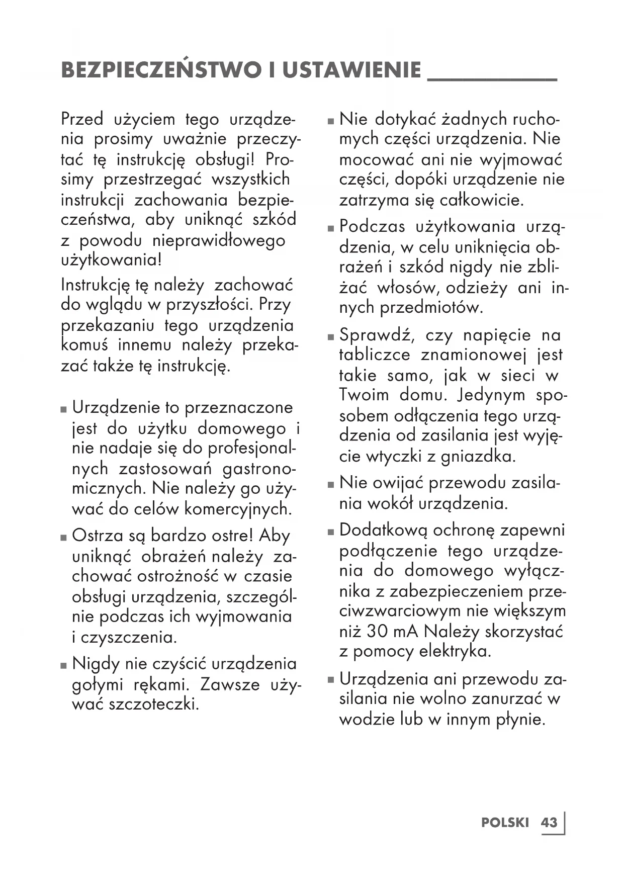 Ostrza są bardzo ostre! Aby uniknąć obrażeń należy za- chować ostrożność w czasie obsługi urządzenia, szczegól- nie podczas ich wyjmowania i czyszczenia.