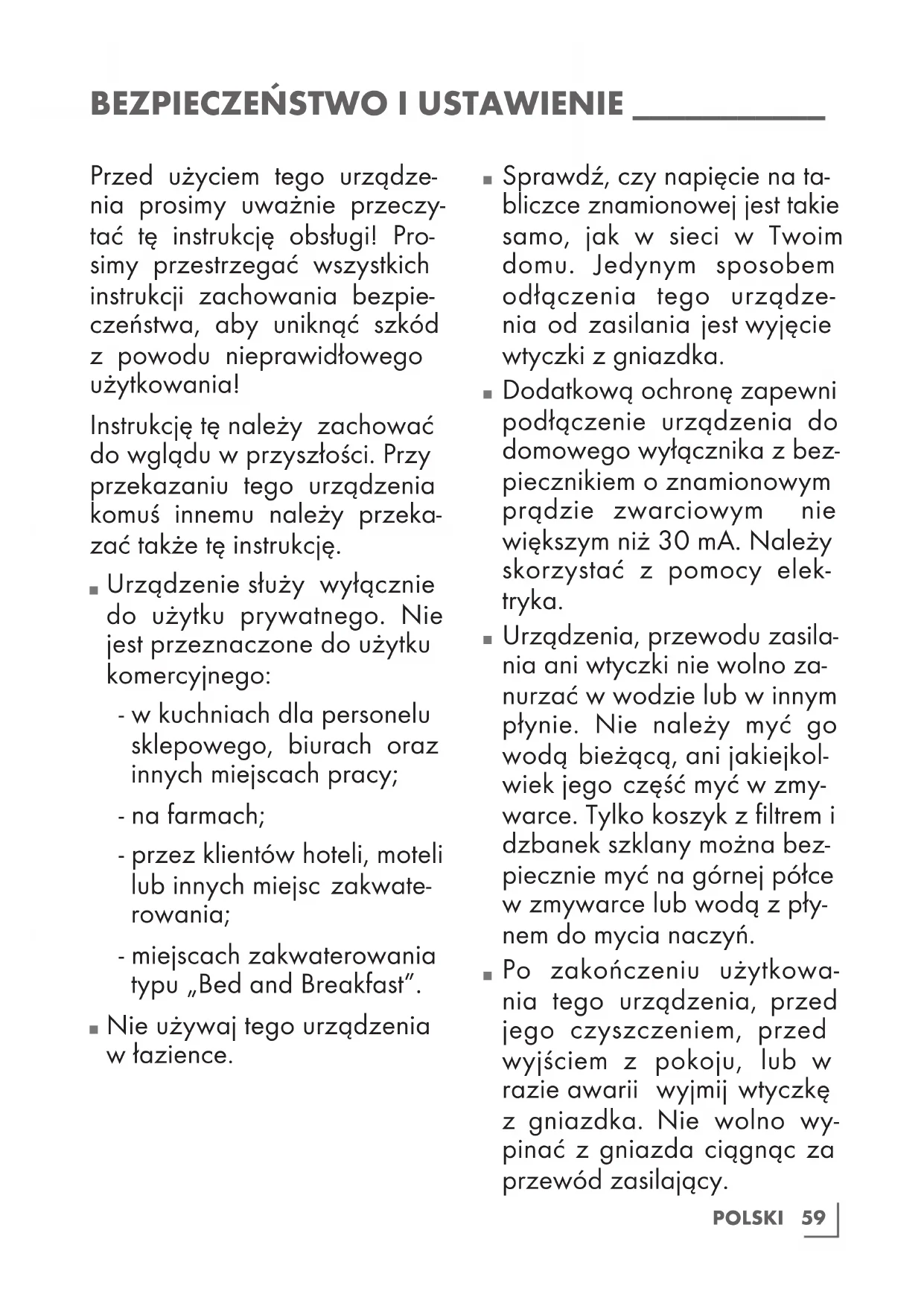 Urządzenia, przewodu zasila- nia ani wtyczki nie wolno za- nurzać w wodzie lub w innym płynie. Nie należy myć go wodą bieżącą, ani jakiejkol- wiek jego część myć w zmy- warce. Tylko koszyk z filtrem i dzbanek szklany można bez- piecznie myć na górnej półce w zmywarce lub wodą z pły- nem do mycia naczyń.