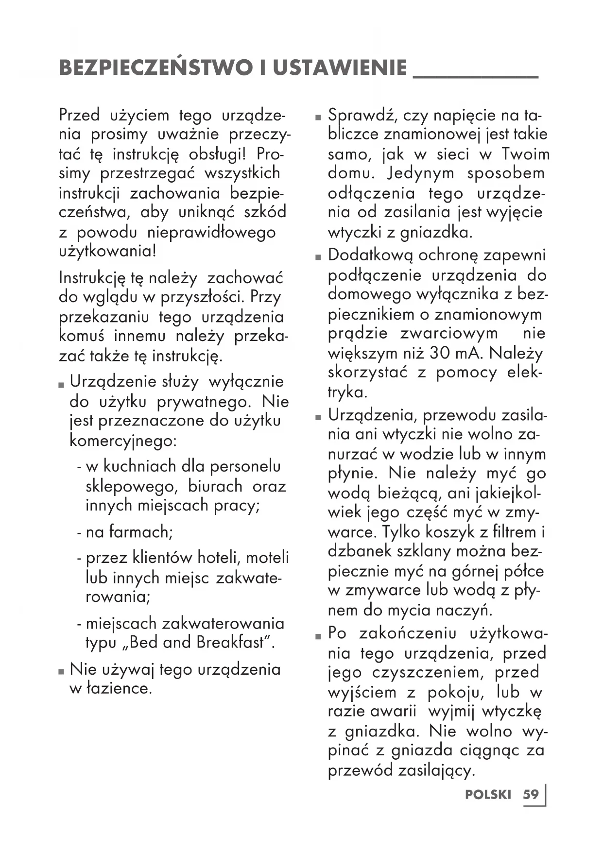 Urządzenia, przewodu zasila- nia ani wtyczki nie wolno za- nurzać w wodzie lub w innym płynie. Nie należy myć go wodą bieżącą, ani jakiejkol- wiek jego część myć w zmy- warce. Tylko koszyk z filtrem i dzbanek szklany można bez- piecznie myć na górnej półce w zmywarce lub wodą z pły- nem do mycia naczyń.