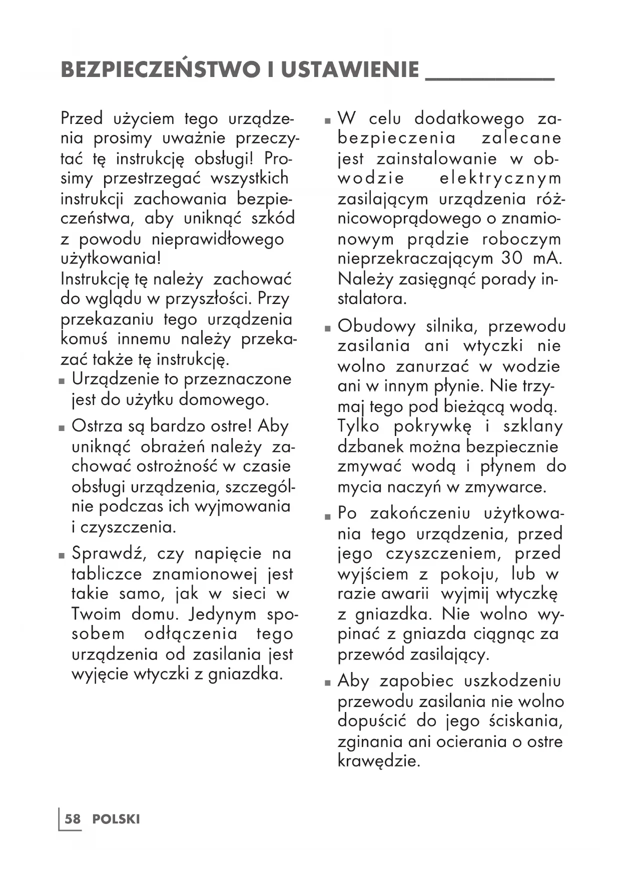 Nie używaj wrzątku. Łożyska zespołu ostrza zaopatrzono w permanentne smarowanie; kontakt z wrzącą wodą może je uszkodzić i skrócić żywotność blendera.65 POLSKI INFORMACJA _____________________________ Uwaga