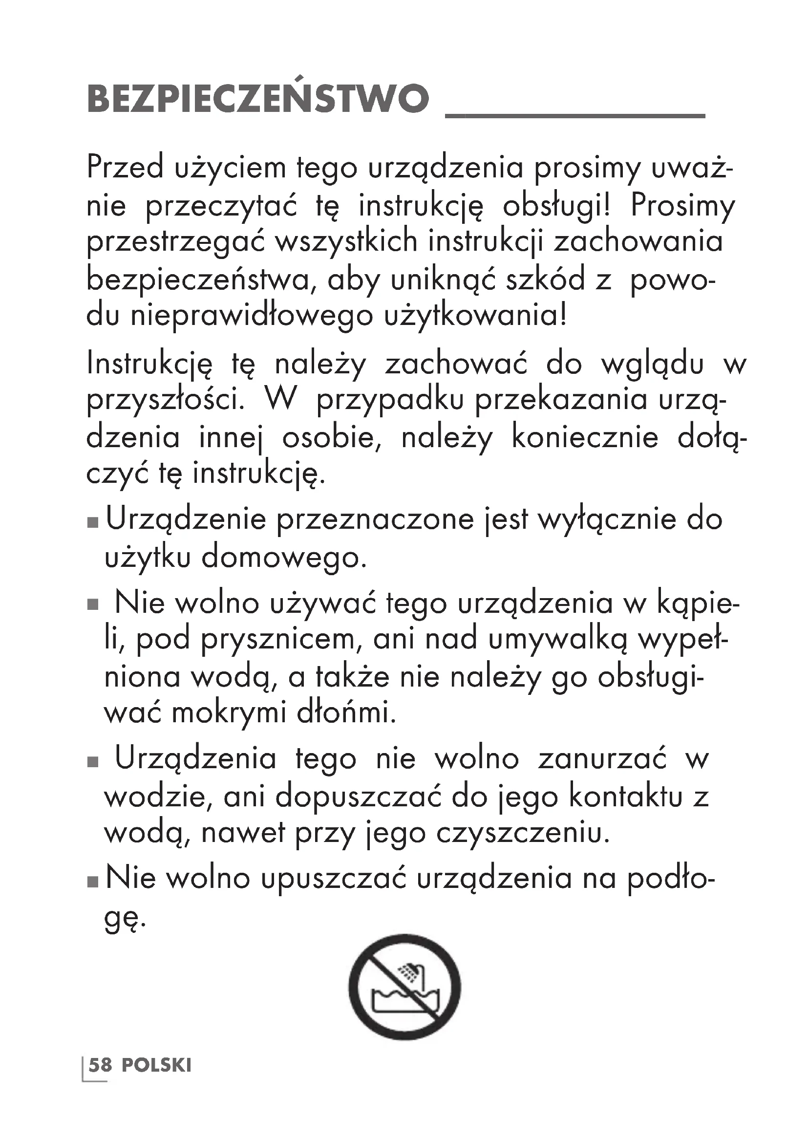 Nie wolno używać tego urządzenia w kąpie- li, pod prysznicem, ani nad umywalką wypeł- niona wodą, a także nie należy go obsługi- wać mokrymi dłońmi.
