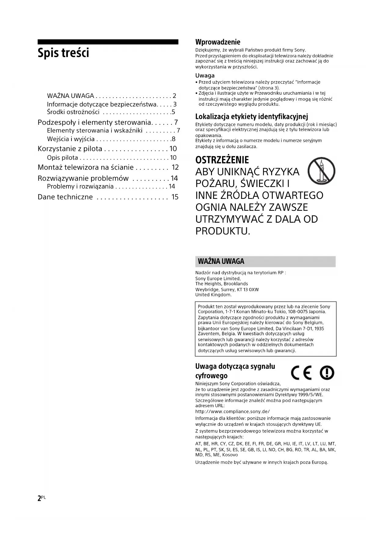 PRODUKTU. Nadzór nad dystrybucją na terytorium RP :Sony Europe Limited,The Heights, BrooklandsWeybridge, Surrey, KT 13 0XWUnited Kingdom. Uwaga dotycząca sygnału cyfrowego Niniejszym Sony Corporation oświadcza, że to urządzenie jest zgodne z zasadniczymi wymaganiami oraz innymi stosownymi postanowieniami Dyrektywy 1999/5/WE.Szczegółowe informacje znaleźć można pod następującym adresem URL:http://www.compliance.sony.de/Informacja dla klientów: poniższe informacje mają zastosowanie wyłącznie do urządzeń w krajach stosujących dyrektywy UE.Z systemu bezprzewodowego telewizora można korzystać w następujących krajach:AT, BE, HR, CY, CZ, DK, EE, FI, FR, DE, GR, HU, IE, IT, LV, LT, LU, MT, NL, PL, PT, SK, SI, ES, SE, GB, IS, LI, NO, CH, BG, RO, TR, AL, BA, MK, MD, RS, ME, KosovoUrządzenie może być używane w innych krajach poza Europą.