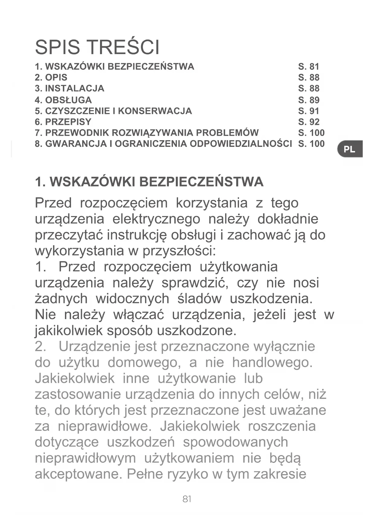 do użytku domowego, a nie handlowego. Jakiekolwiek inne użytkowanie lub zastosowanie urządzenia do innych celów, niż te, do których jest przeznaczone jest uważane za nieprawidłowe. Jakiekolwiek roszczenia dotyczące uszkodzeń spowodowanych nieprawidłowym użytkowaniem nie będą akceptowane. Pełne ryzyko w tym zakresie S. 81 S. 88 S. 88 S. 89 S. 91 S. 92 S. 100 S. 10082