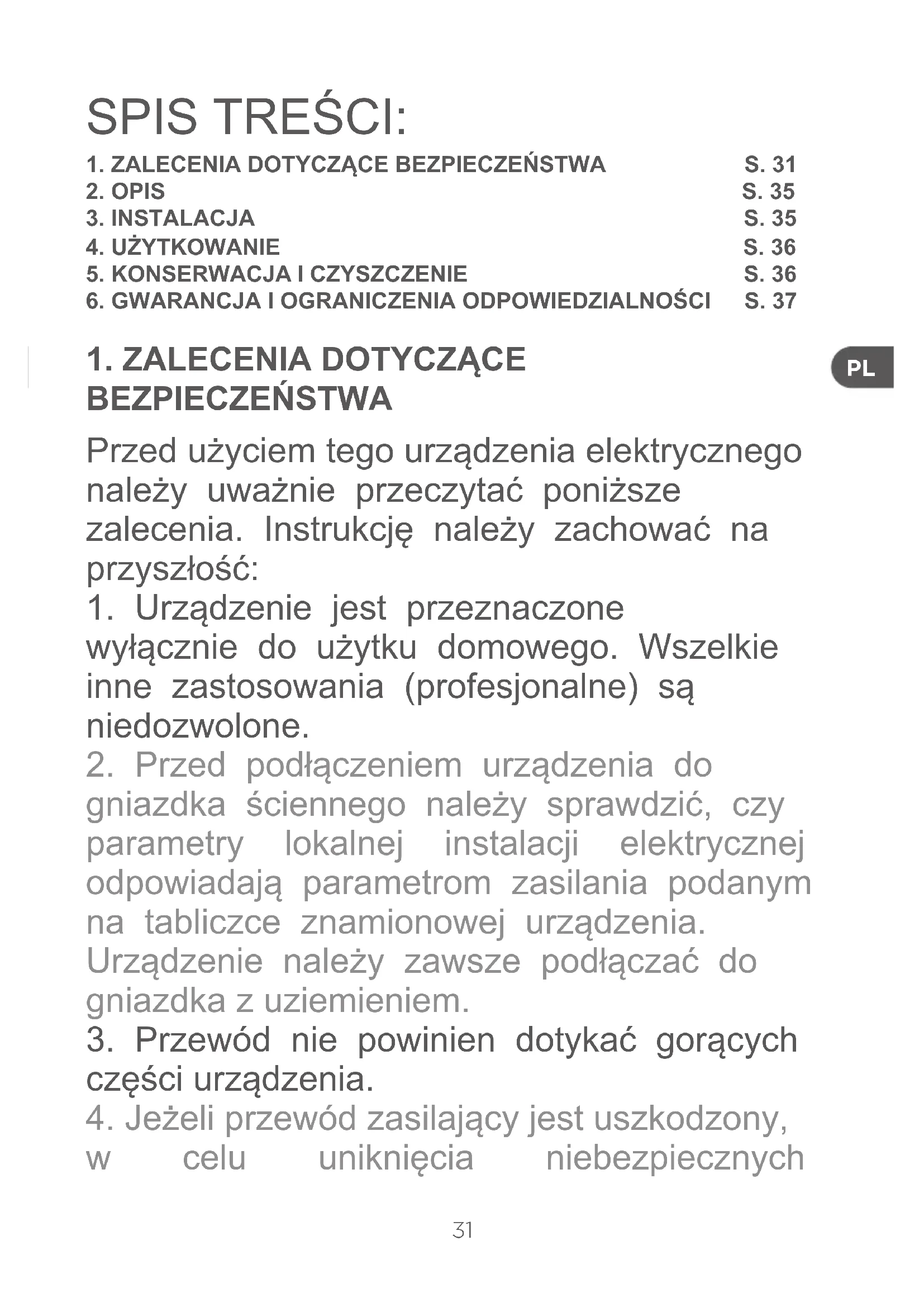 BEZPIECZEŃSTWA Przed użyciem tego urządzenia elektrycznego należy uważnie przeczytać poniższe zalecenia. Instrukcję należy zachować na przyszłość: