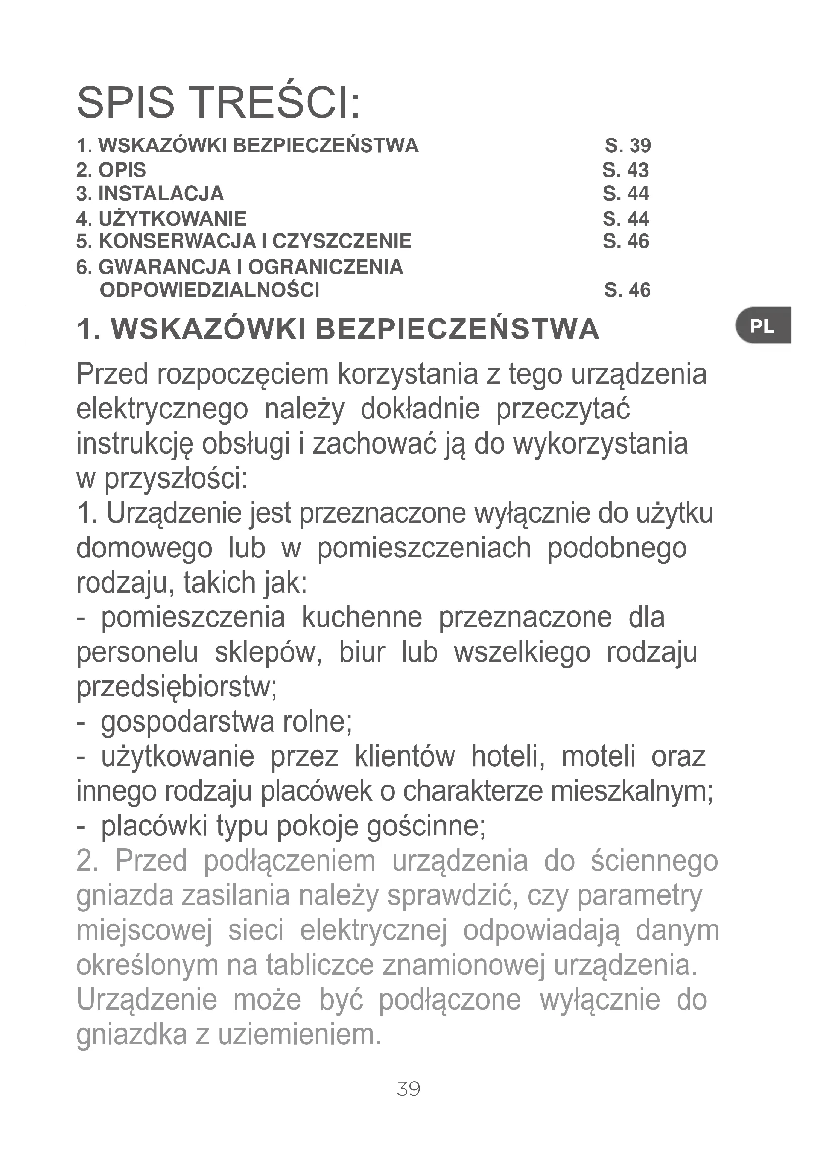 gniazda zasilania należy sprawdzić, czy parametry miejscowej sieci elektrycznej odpowiadają danym określonym na tabliczce znamionowej urządzenia. Urządzenie może być podłączone wyłącznie do gniazdka z uziemieniem. SPIS TREŚCI: