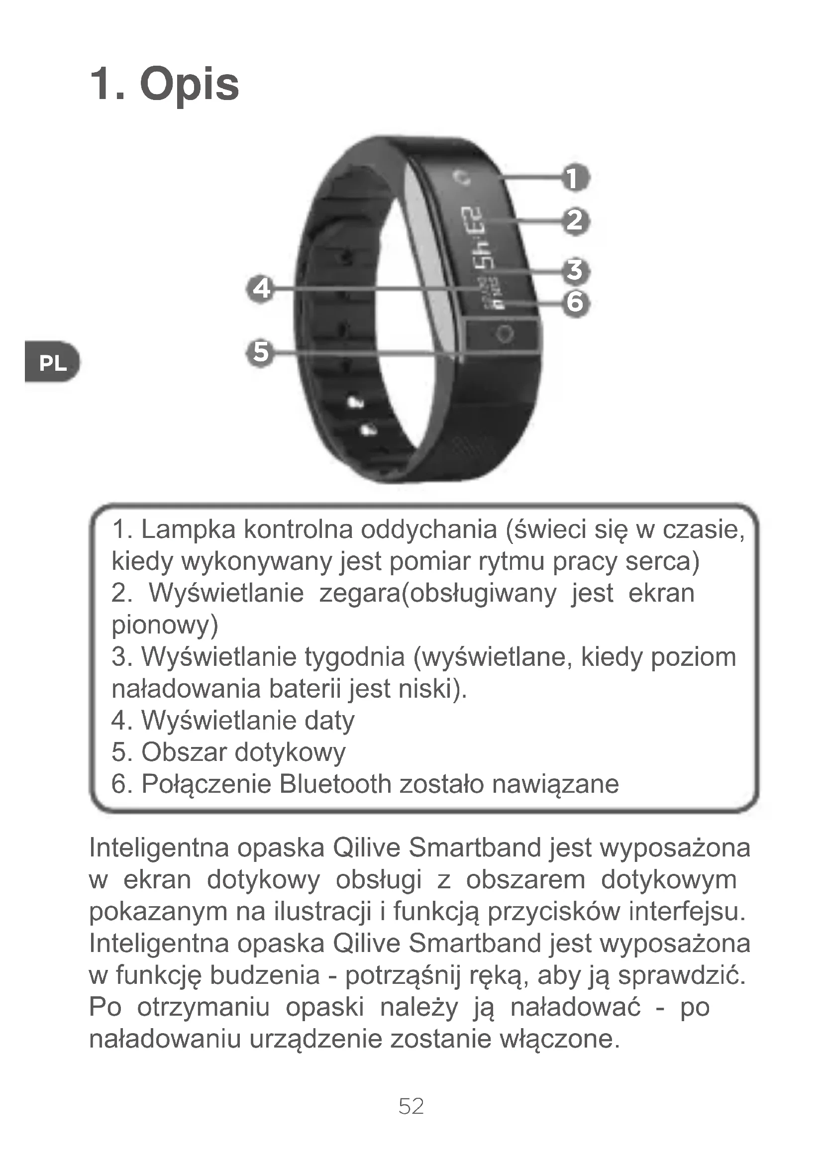 Inteligentna opaska Qilive Smartband jest wyposażona w ekran dotykowy obsługi z obszarem dotykowym pokazanym na ilustracji i funkcją przycisków interfejsu. Inteligentna opaska Qilive Smartband jest wyposażona w funkcję budzenia - potrząśnij ręką, aby ją sprawdzić. Po otrzymaniu opaski należy ją naładować - po naładowaniu urządzenie zostanie włączone.53