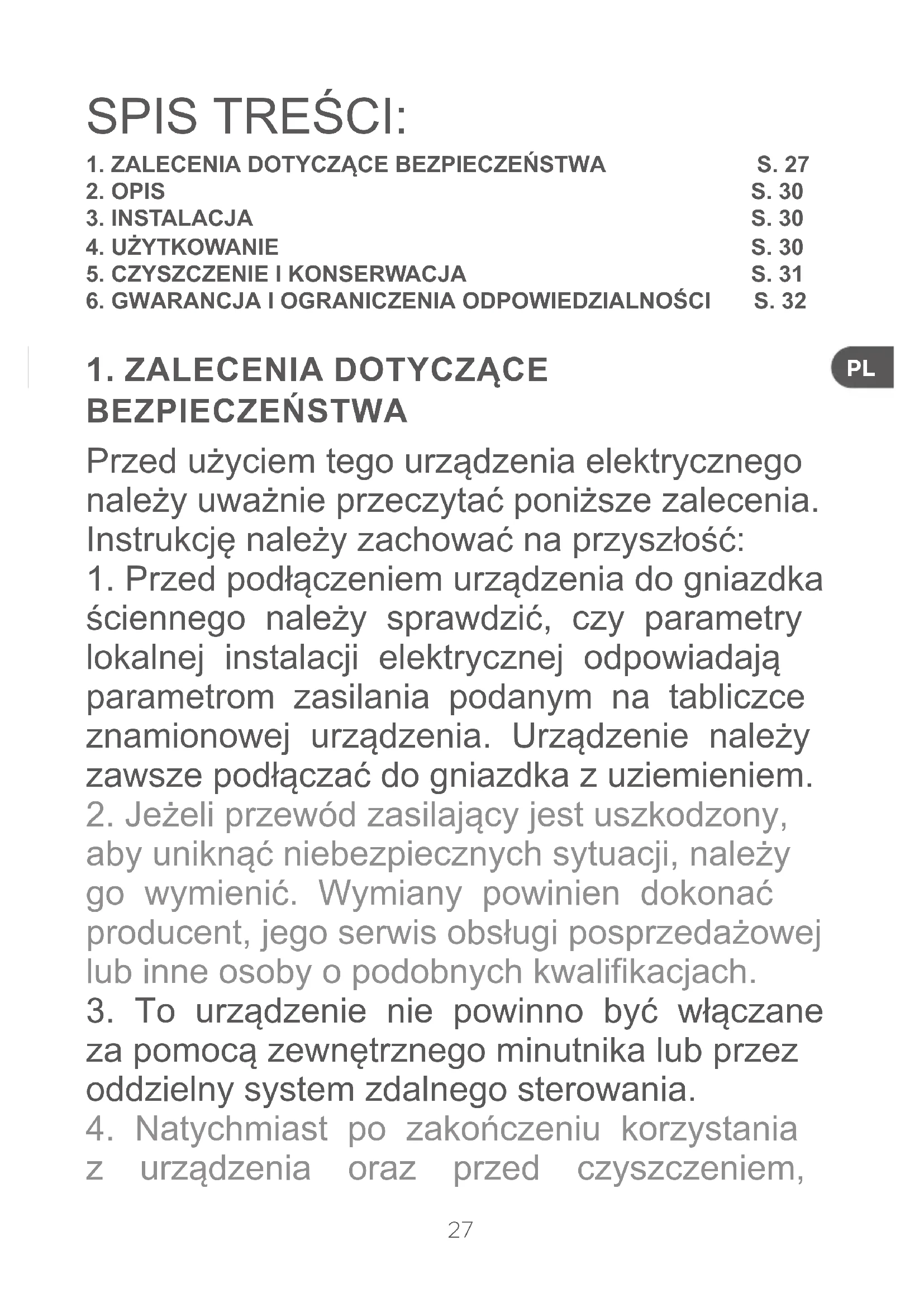 BEZPIECZEŃSTWA Przed użyciem tego urządzenia elektrycznego należy uważnie przeczytać poniższe zalecenia. Instrukcję należy zachować na przyszłość:
