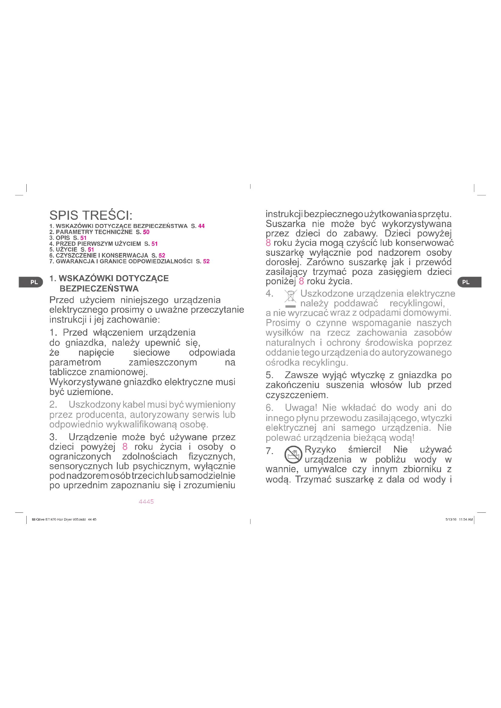 Ryzyko śmierci! Nie używać urządzenia w pobliżu wody w wannie, umywalce czy innym zbiorniku z wodą. Trzymać suszarkę z dala od wody i IM-Qilive-871470-Hair Dryer-V05.indd 44-45 5/13/16 11:54 AM46 47 innych płynów, jeśli suszarka nie jest używana ale wtyczka jest włączona do gniazda.