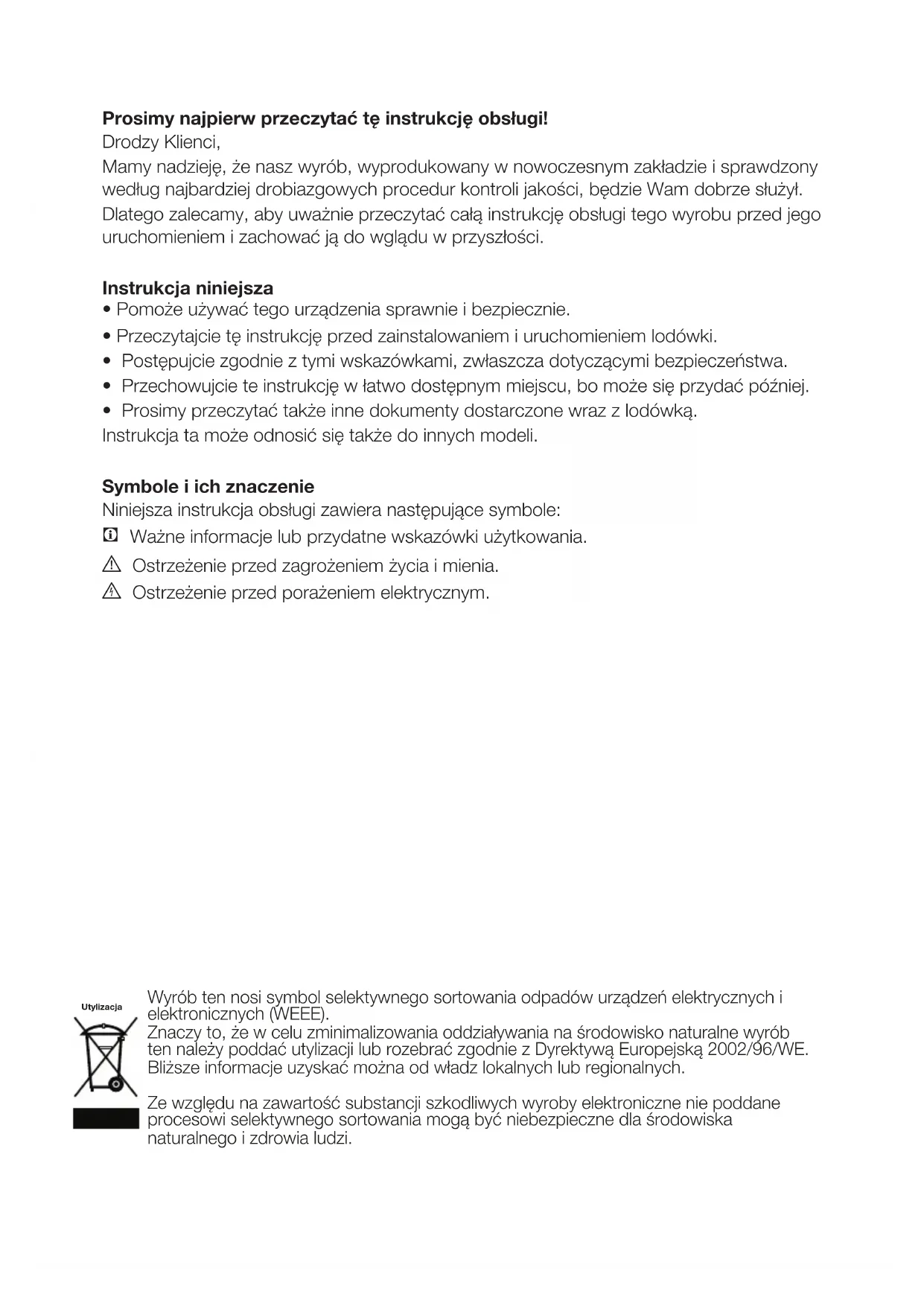 - Prosimy przeczytać także inne dokumenty dostarczone wraz z lodówką. Instrukcja ta może odnosić się także do innych modeli. Symbole i ich znaczenie Niniejsza instrukcja obsługi zawiera następujące symbole: C Ważne informacje lub przydatne wskazówki użytkowania. A Ostrzeżenie przed zagrożeniem życia i mienia. B Ostrzeżenie przed porażeniem elektrycznym. Wyrób ten nosi symbol selektywnego sortowania odpadów urządzeń elektrycznych i elektronicznych (WEEE). Znaczy to, że w celu zminimalizowania oddziaływania na środowisko naturalne wyrób ten należy poddać utylizacji lub rozebrać zgodnie z Dyrektywą Europejską 2002/96/WE. Bliższe informacje uzyskać można od władz lokalnych lub regionalnych. Ze względu na zawartość substancji szkodliwych wyroby elektroniczne nie poddane procesowi selektywnego sortowania mogą być niebezpieczne dla środowiska naturalnego i zdrowia ludzi. UtylizacjaPL