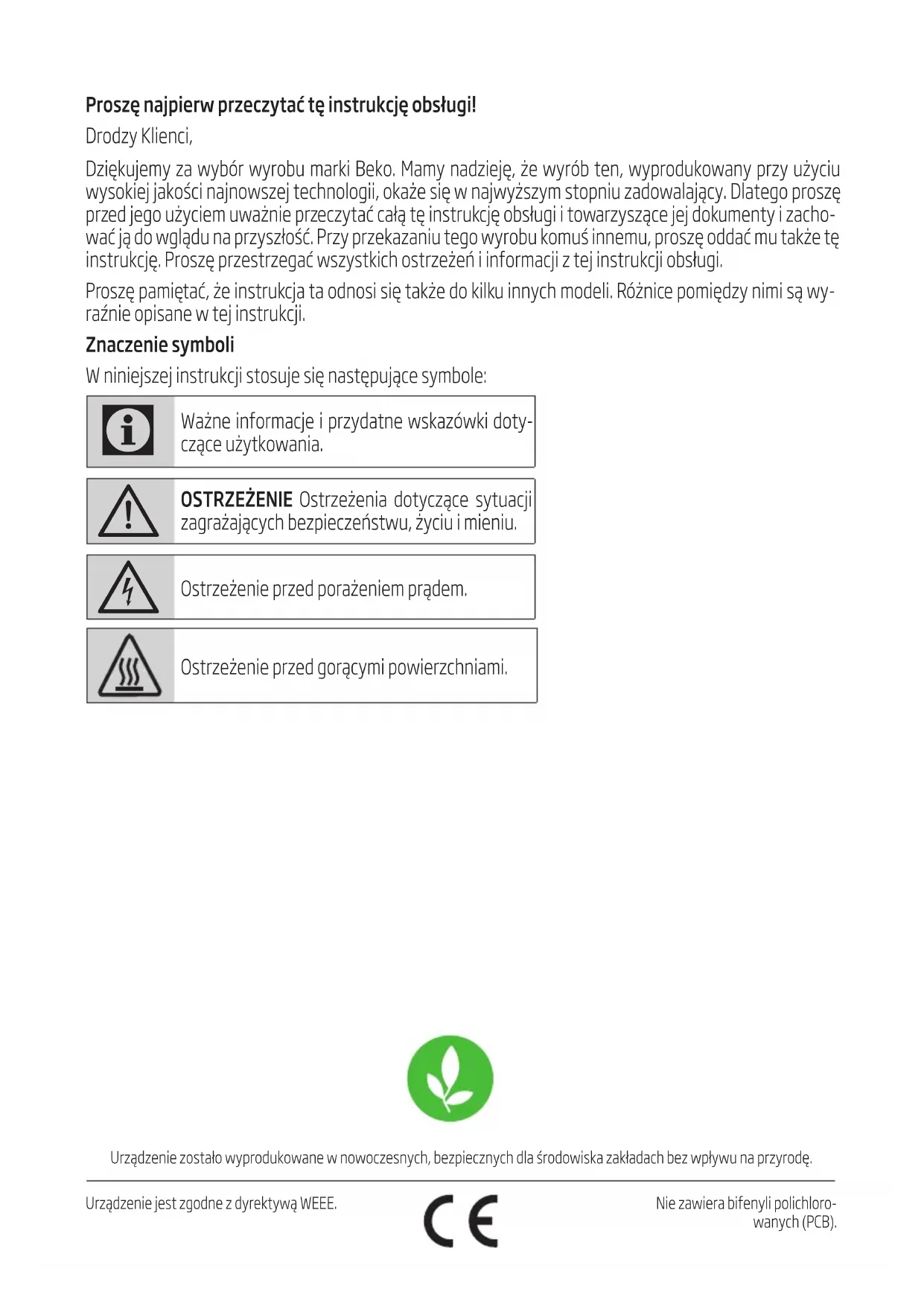 ĮSPĖJIMAS: Prieš liesdami lemputes, įsitikinkite, kad jos atvėso. Norėdami pakeisti lemputes, kreip-kitės į įgaliotąjį priežiūros atstovą.Urządzenie zostało wyprodukowane w nowoczesnych, bezpiecznych dla środowiska zakładach bez wpływu na przyrodę. Urządzenie jest zgodne z dyrektywą WEEE. Nie zawiera bifenyli polichloro- wanych (PCB). Proszę najpierw przeczytać tę instrukcję obsługi! Drodzy Klienci, Dziękujemy za wybór wyrobu marki Beko. Mamy nadzieję, że wyrób ten, wyprodukowany przy użyciu wysokiej jakości najnowszej technologii, okaże się w najwyższym stopniu zadowalający. Dlatego proszę przed jego użyciem uważnie przeczytać całą tę instrukcję obsługi i towarzyszące jej dokumenty i zacho- wać ją do wglądu na przyszłość. Przy przekazaniu tego wyrobu komuś innemu, proszę oddać mu także tę instrukcję. Proszę przestrzegać wszystkich ostrzeżeń i informacji z tej instrukcji obsługi. Proszę pamiętać, że instrukcja ta odnosi się także do kilku innych modeli. Różnice pomiędzy nimi są wy- raźnie opisane w tej instrukcji. Znaczenie symboli W niniejszej instrukcji stosuje się następujące symbole: