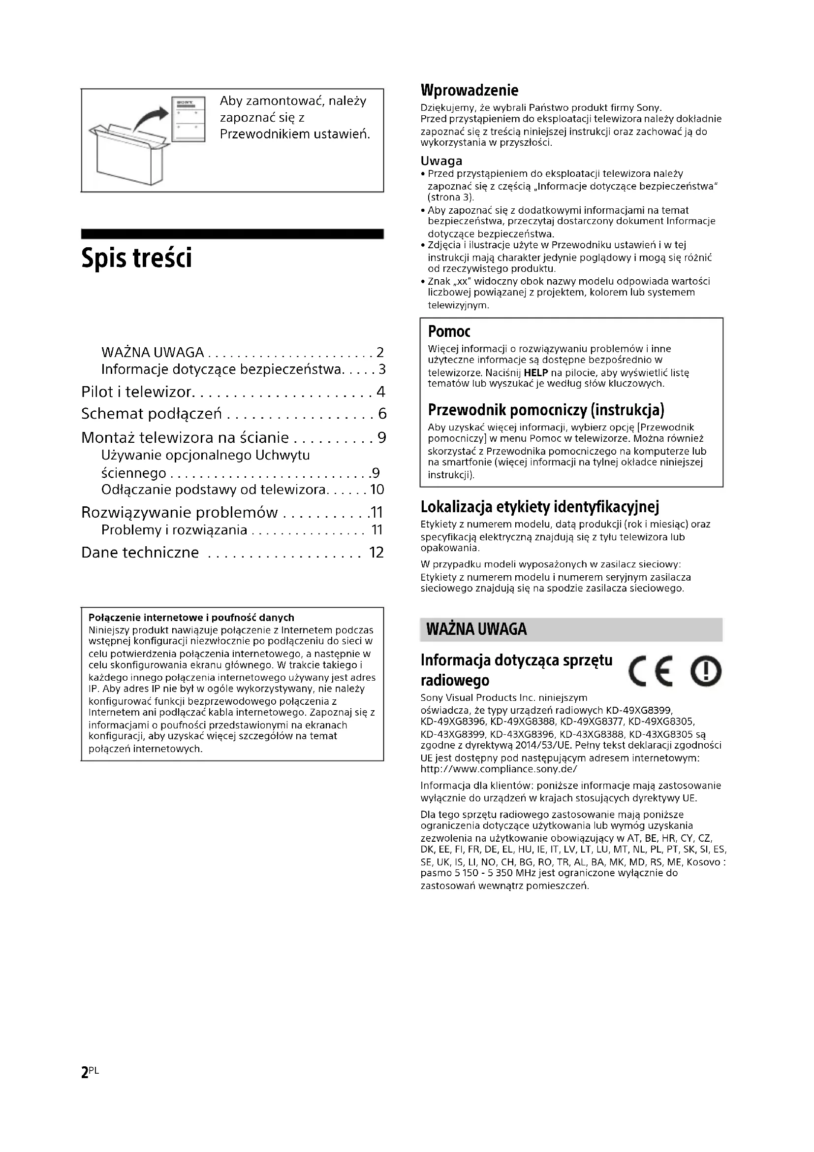 Informacja dotycząca sprzętu radiowego Sony Visual Products Inc. niniejszym oświadcza, że typy urządzeń radiowych KD-49XG8399, KD-49XG8396, KD-49XG8388, KD-49XG8377, KD-49XG8305, KD-43XG8399, KD-43XG8396, KD-43XG8388, KD-43XG8305 są zgodne z dyrektywą 2014/53/UE. Pełny tekst deklaracji zgodności UE jest dostępny pod następującym adresem internetowym: http://www.compliance.sony.de/Informacja dla klientów: poniższe informacje mają zastosowanie wyłącznie do urządzeń w krajach stosujących dyrektywy UE.Dla tego sprzętu radiowego zastosowanie mają poniższe ograniczenia dotyczące użytkowania lub wymóg uzyskania zezwolenia na użytkowanie obowiązujący w AT, BE, HR, CY, CZ, DK, EE, FI, FR, DE, EL, HU, IE, IT, LV, LT, LU, MT, NL, PL, PT, SK, SI, ES, SE, UK, IS, LI, NO, CH, BG, RO, TR, AL, BA, MK, MD, RS, ME, Kosovo :pasmo 5 150 - 5 350 MHz jest ograniczone wyłącznie do zastosowań wewnątrz pomieszczeń. Aby zamontować, należy zapoznać się z Przewodnikiem ustawień. Połączenie internetowe i poufność danychNiniejszy produkt nawiązuje połączenie z Internetem podczas wstępnej konfiguracji niezwłocznie po podłączeniu do sieci w celu potwierdzenia połączenia internetowego, a następnie w celu skonfigurowania ekranu głównego. W trakcie takiego i każdego innego połączenia internetowego używany jest adres IP. Aby adres IP nie był w ogóle wykorzystywany, nie należy konfigurować funkcji bezprzewodowego połączenia z Internetem ani podłączać kabla internetowego. Zapoznaj się z informacjami o poufności przedstawionymi na ekranach konfiguracji, aby uzyskać więcej szczegółów na temat połączeń internetowych. Pomoc Więcej informacji o rozwiązywaniu problemów i inne użyteczne informacje są dostępne bezpośrednio w telewizorze. Naciśnij HELP na pilocie, aby wyświetlić listę tematów lub wyszukać je według słów kluczowych. Przewodnik pomocniczy (instrukcja) Aby uzyskać więcej informacji, wybierz opcję [Przewodnik pomocniczy] w menu Pomoc w telewizorze. Można również skorzystać z Przewodnika pomocniczego na komputerze lub na smartfonie (więcej informacji na tylnej okładce niniejszej instrukcji).D:\_SONY TV\CHH2\SY19_CHH2_EU_RG_131\4748430131\4748430131_12PL\4748430131_12PL.fm master page: Right KD-49XG83xx / 43XG83xx 4-748-430-13(1)