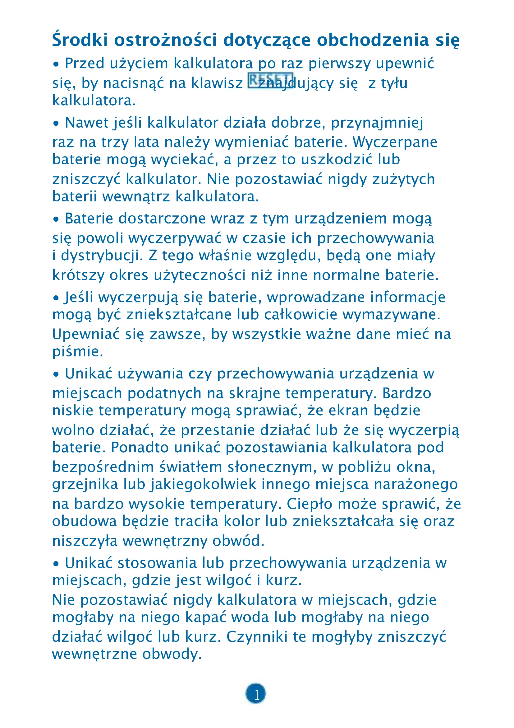 - Unikać stosowania lub przechowywania urządzenia w miejscach, gdzie jest wilgoć i kurz. Nie pozostawiać nigdy kalkulatora w miejscach, gdzie mogłaby na niego kapać woda lub mogłaby na niego działać wilgoć lub kurz. Czynniki te mogłyby zniszczyć wewnętrzne obwody.2